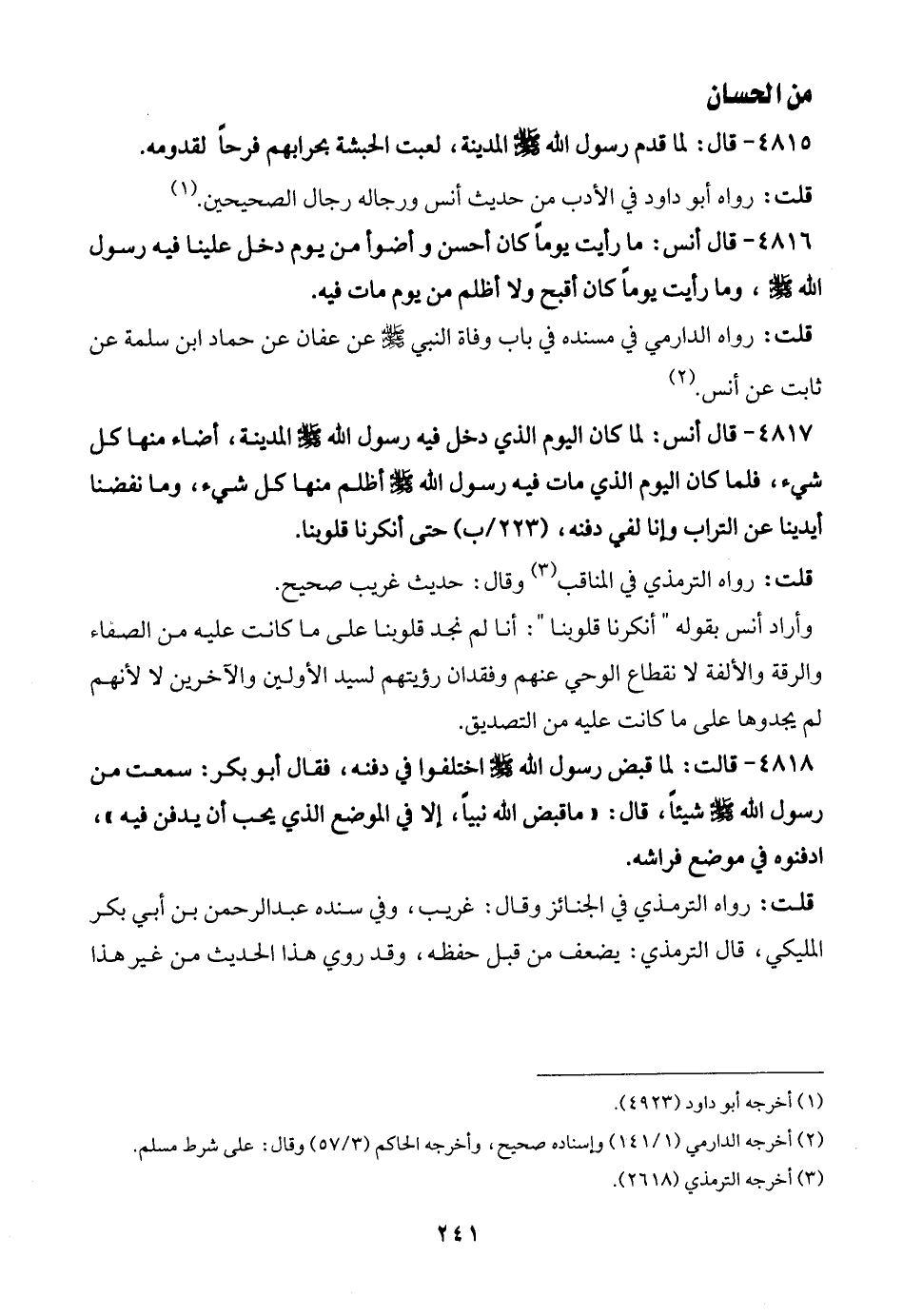 قلت: رواه الدارمي في مسنده في باب وفاة النبي -صلى الله عليه وسلم- عن عفان عن حماد ابن سلمة عن ثابت عن أنس. (¬2)