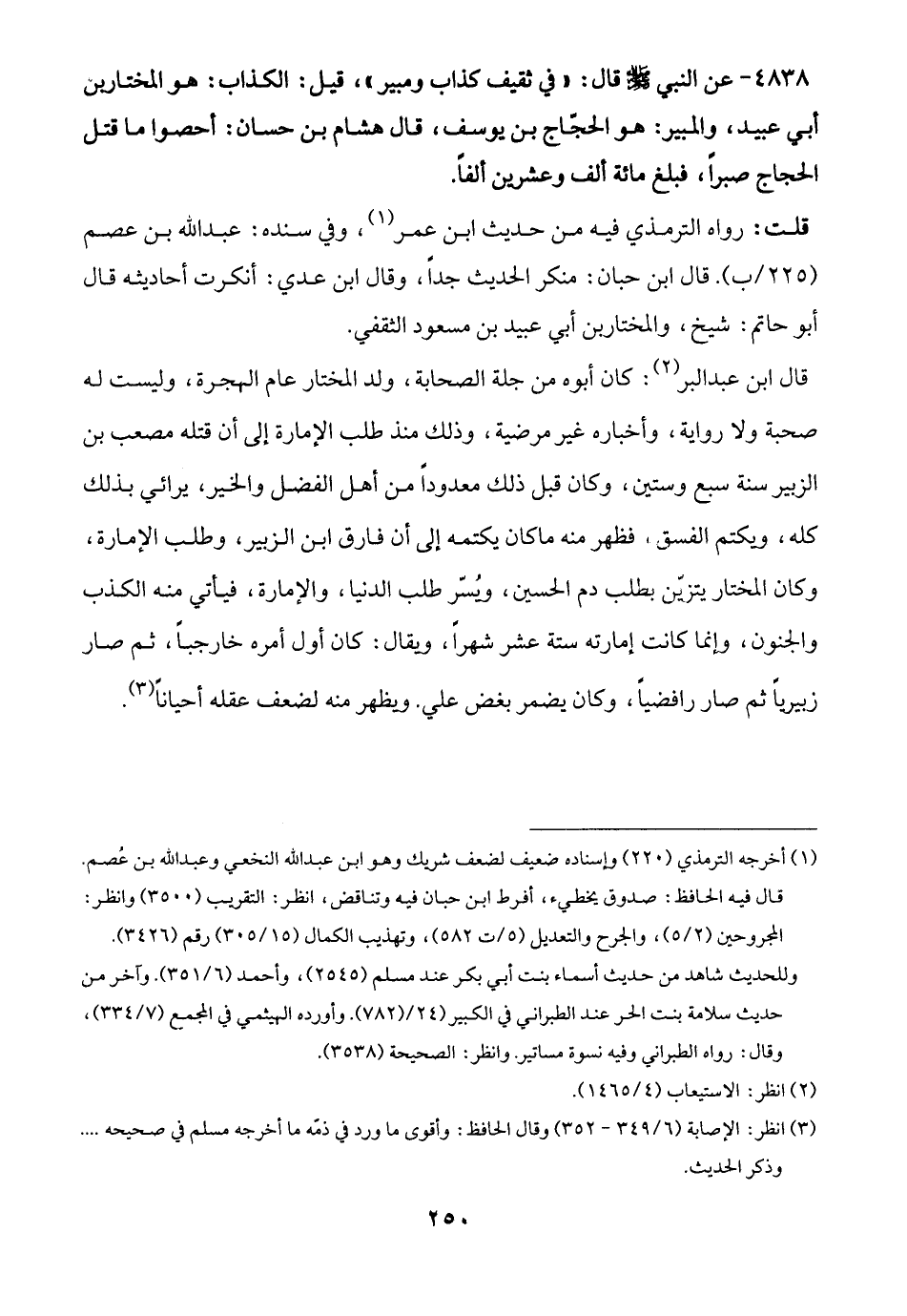 4838 - عن النبي -صلى الله عليه وسلم- قال: "في ثقيف كذاب ومبير"، قيل: الكذاب: هو المختار بن أبي عبيد، والمبير: هو الحجّاج بن يوسف، قال هشام بن حسان: أحصوا ما قتل الحجاج صبرًا، فبلغ مائة ألف وعشرين ألفًا.