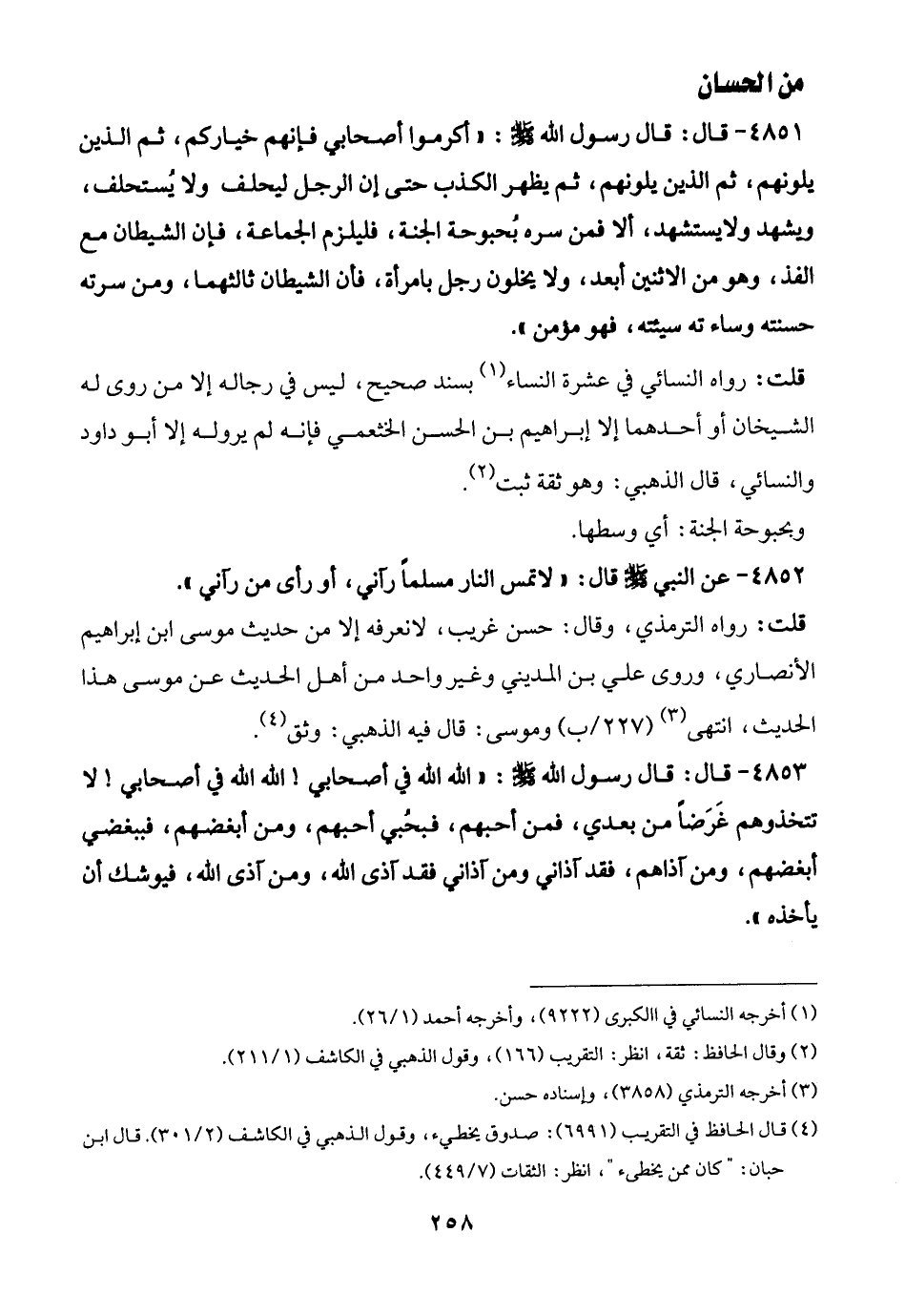 4851 - قال: قال رسول الله -صلى الله عليه وسلم-: "أكرموا أصحابي فإنهم خياركم، ثم الذين يلونهم، ثم الذين يلونهم، ثم يظهر الكذب حتى إن الرجل ليحلف ولا يُستحلف، ويشهد ولا يستشهد، ألا فمن سره بُحبوحة الجنة، فليلزم الجماعة، فإن الشيطان مع الفذ، وهو من الاثنين أبعد، ولا يخلون رجل بامرأة، فأن الشيطان ثالثهما، ومن سرته حسنته وساءته سيئته، فهو مؤمن".