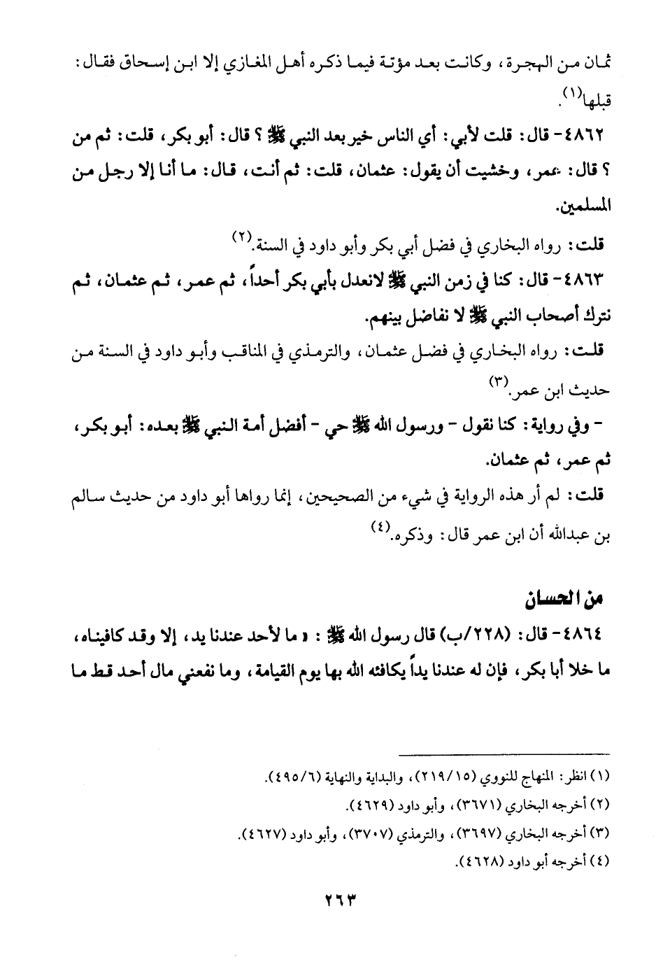 4863 - قال: كنا في زمن النبي -صلى الله عليه وسلم- لا نعدل بأبي بكر أحدًا، ثم عمر، ثم عثمان، ثم نترك أصحاب النبي -صلى الله عليه وسلم- لا نفاضل بينهم.