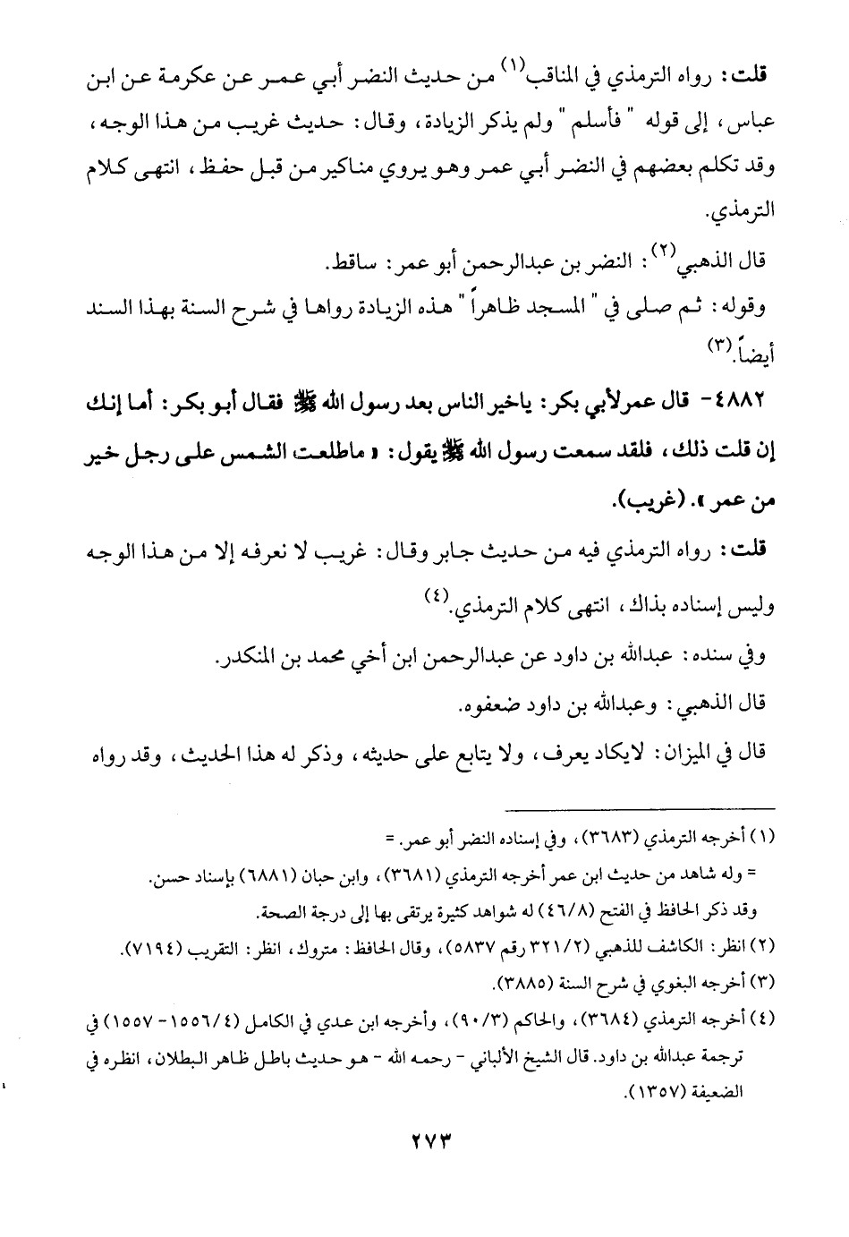 (¬4) أخرجه الترمذي (3684)، والحاكم (3/ 90)، وأخرجه ابن عدي في الكامل (4/ 1556 - 1557) في ترجمة عبد الله بن داود. قال الشيخ الألباني -رحمه الله- هو حديث باطل ظاهر البطلان، انظره في الضعيفة (1357).