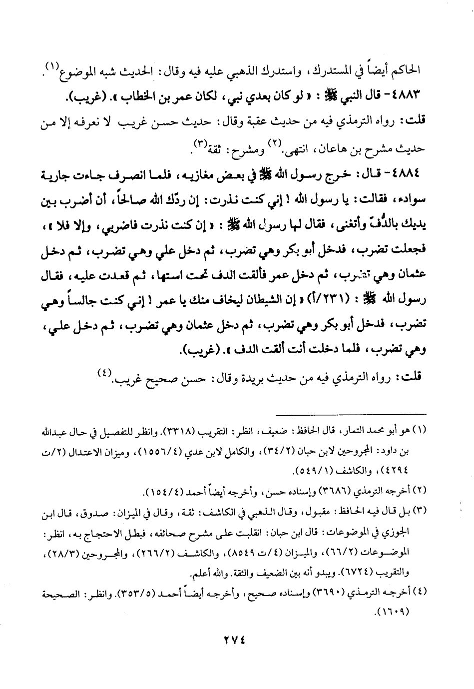 4884 - قال: خرج رسول الله -صلى الله عليه وسلم- في بعض مغازيه، فلما انصرف جاءت جارية سوادء، فقالت: يا رسول الله! إني كنت نذرت: إن ردّك الله صالحًا، أن أضرب بين يديك بالدُّفّ وأتغنى، فقال لها رسول الله-صلى الله عليه وسلم -: "إن كنت نذرت فاضربي، وإلا فلا"، فجعلت تضرب، فدخل أبو بكر وهي تضرب، ثم دخل علي وهي تضرب، ثم دخل عثمان وهي تضرب، ثم دخل عمر فألقت الدف تحت استها، ثم قعدت عليه، فقال رسول الله -صلى الله عليه وسلم-: "إن الشيطان ليخاف منك يا عمر! إني كنت جالسًا وهي تضرب، فدخل أبو بكر وهي تضرب، ثم دخل عثمان وهي تضرب، ثم دخل علي، وهي تضرب، فلما دخلت أنت ألقت الدف". (غريب).