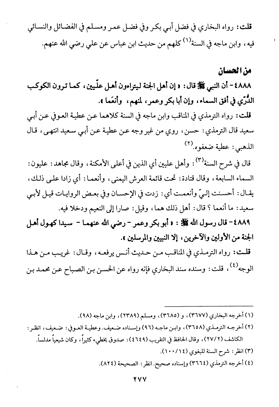 4888 - أن النبي -صلى الله عليه وسلم- قال: "إن أهل الجنة ليتراءون أهل علّيين، كما ترون الكوكب الدُّرّي في أفق السماء، وإن أبا بكر وعمر، لمنهم، وأنعَما".
