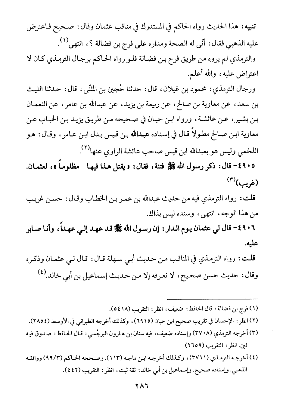 4905 - قال: ذكر رسول الله -صلى الله عليه وسلم- فتنة، فقال: "يقتل هذا فيها مظلومًا"، لعثمان. (غريب) (¬3)