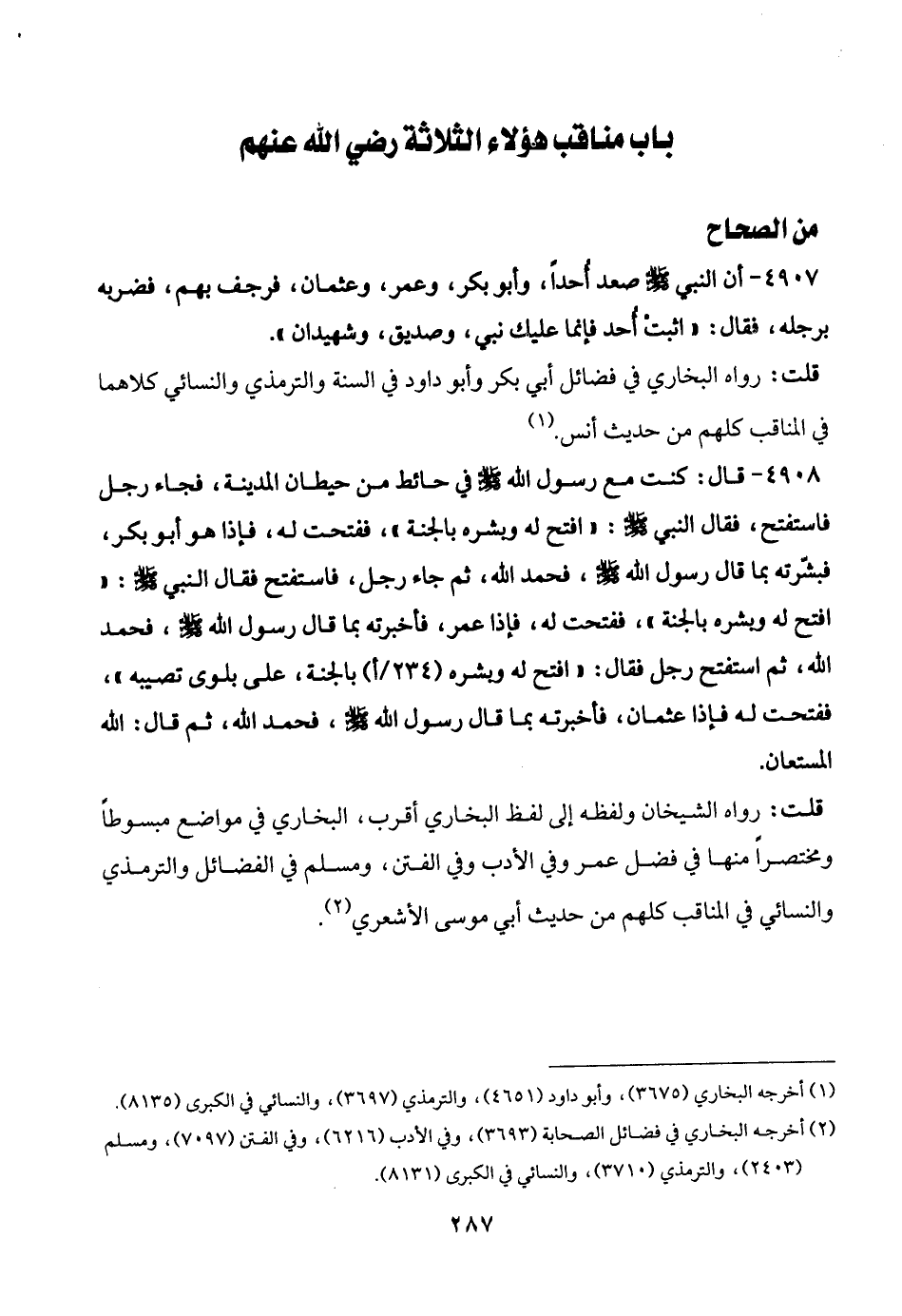 4907 - أن النبي -صلى الله عليه وسلم- صعد أُحدًا، وأبو بكر، وعمر، وعثمان، فرجف بهم، فضربه برجله، قال: "اثبتْ أُحد فإنما عليك نبي، وصديق، وشهيدان".