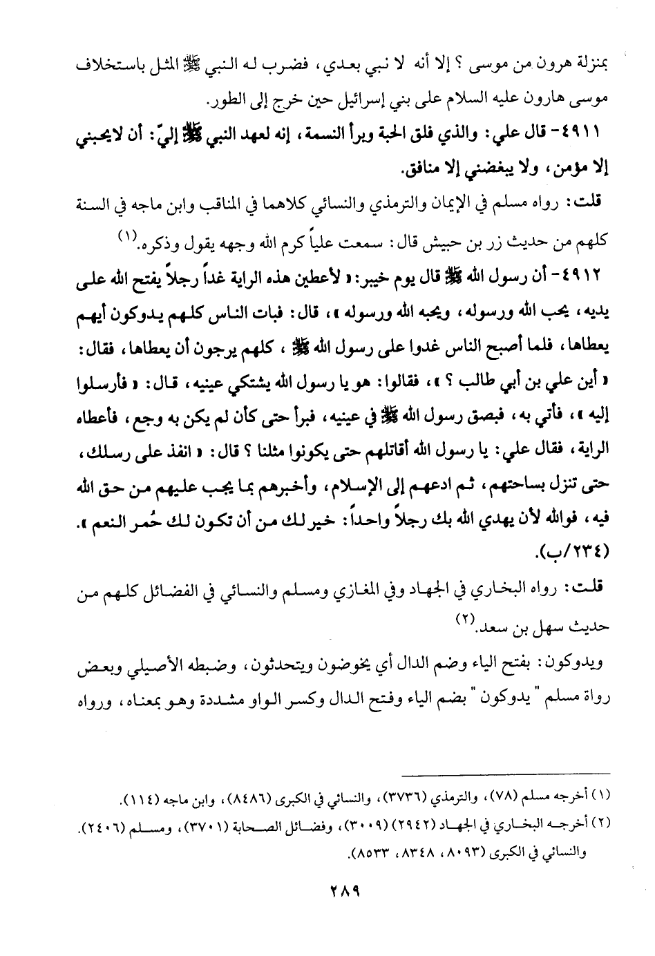 4912 - أن رسول الله -صلى الله عليه وسلم- قال يوم خيبر: "لأعطين هذه الراية غدًا رجلًا يفتح الله على يديه، يحب الله ورسوله، ويحبه الله ورسوله"، قال: فبات الناس كلهم يدوكون أيهم يعطاها، فلما أصبح الناس غدوا على رسول الله -صلى الله عليه وسلم-، كلهم يرجون أن يعطاها، فقال: "أين علي بن أبي طالب؟ "، فقالوا: هو يا رسول الله يشتكي عينيه، قال: "فأرسلوا إليه"، فأتي به، فبصق رسول الله -صلى الله عليه وسلم- في عينيه، فبرأ حتى كأن لم يكن به وجع، فأعطاه الراية، فقال علي: يا رسول الله أقاتلهم حتى يكونوا مثلنا؟ قال: "انفذ على رسلك، حتى تنزل بساحتهم، ثم ادعهم إلى الإسلام، وأخبرهم بما يجب عليهم من حق الله فيه، فوالله لأن يهدي الله بك رجلًا واحدًا: خير لك من أن تكون لك حُمر النعم".