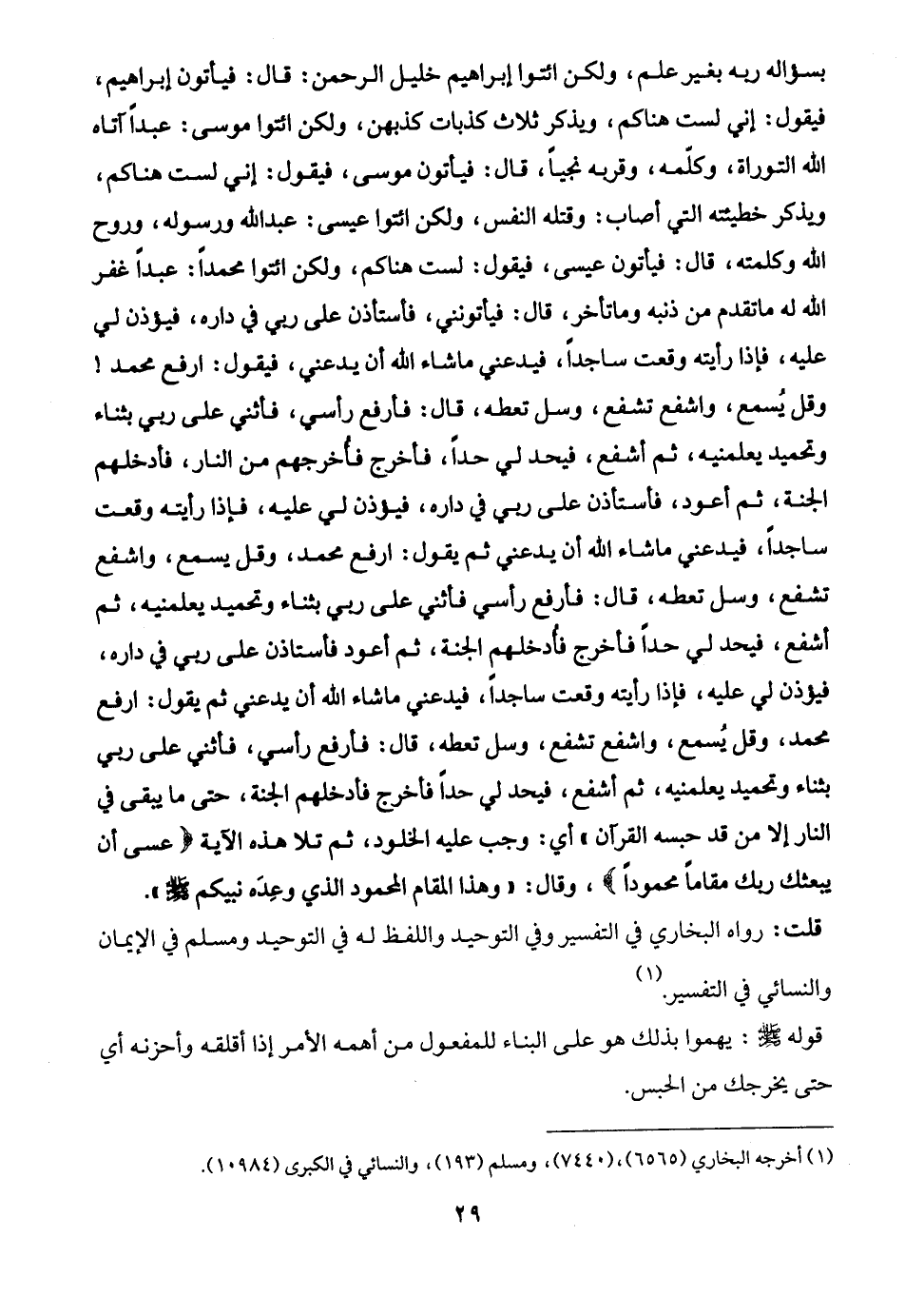 قلت: رواه البخاري في التفسير وفي التوحيد واللفظ له في التوحيد ومسلم في الإيمان والنسائي في التفسير. (¬1)