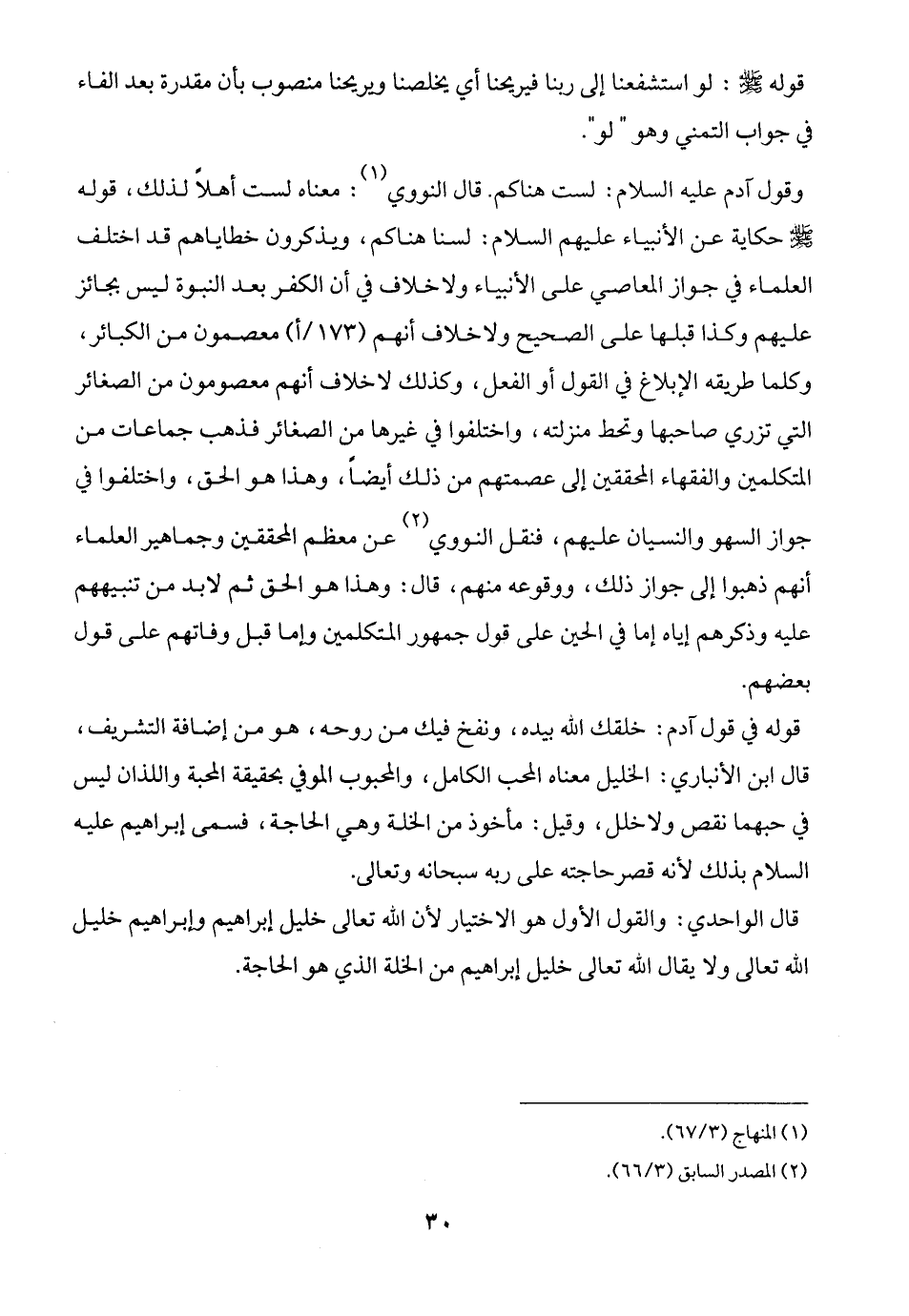 وقول آدم عليه السلام: لست هناكم. قال النووي (¬1): معناه لست أهلًا لذلك، قوله - صلى الله عليه وسلم - حكاية عن الأنبياء عليهم السلام: لسنا هناكم، ويذكرون خطاياهم قد اختلف العلماء في جواز المعاصي على الأنبياء ولا خلاف في أن الكفر بعد النبوة ليس بجائز عليهم وكذا قبلها على الصحيح ولا خلاف أنهم معصمون من الكبائر، وكلما طريقه الإبلاغ في القول أو الفعل، وكذلك لا خلاف أنهم معصومون من الصغائر التي تزري صاحبها وتحط منزلته، واختلفوا في غيرها من الصغائر فذهب جماعات من المتكلمين والفقهاء المحققين إلى عصمتهم من ذلك أيضًا، وهذا هو الحق، واختلفوا في جواز السهو والنسيان عليهم، فنقل النووي (¬2) عن معظم المحققين وجماهير العلماء أنهم ذهبوا إلى جواز ذلك، ووقوعه منهم، قال: وهذا هو الحق ثم لا بد من تنبيههم عليه وذكرهم إياه إما في الحين على قول جمهور المتكلمين وإما قبل وفاتهم على قول بعضهم.