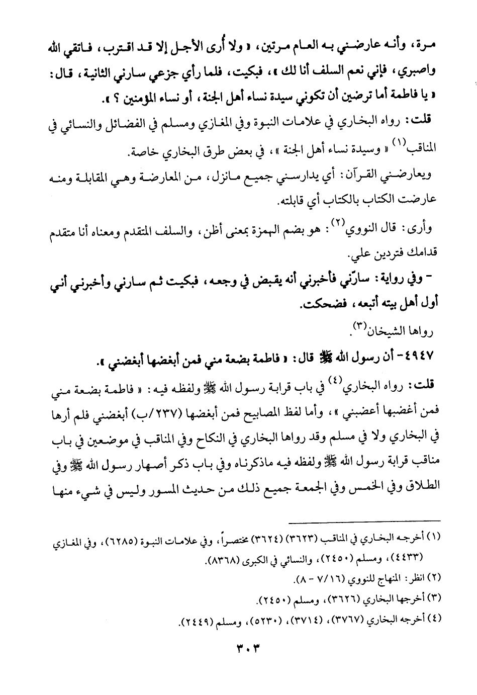 مرة، وأنه عارضني به العام مرتين، "ولا أُرى الأجل إلا قد اقترب، فاتقي الله واصبري، فإني نعم السلف أنا لك"، فبكيت، فلما رأي جزعي سارني الثانية، قال: "يا فاطمة أما ترضين أن تكوني سيدة نساء أهل الجنة، أو نساء المؤمنين؟ ".
