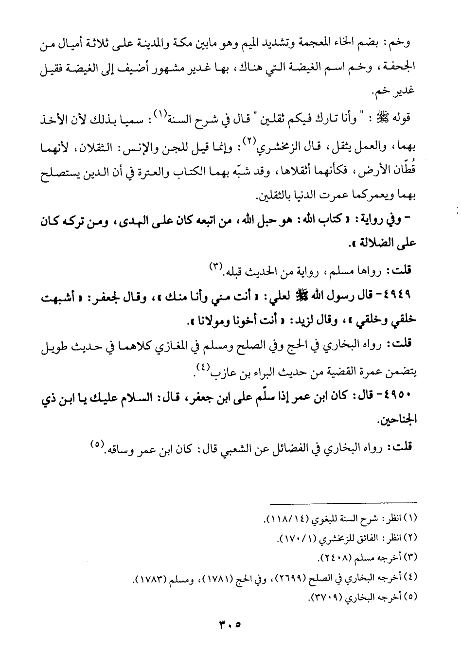 قوله -صلى الله عليه وسلم-: "وأنا تارك فيكم ثقلين" قال في شرح السنة (¬1): سميا بذلك لأن الأخذ بهما، والعمل يثقل، قال الزمخشري (¬2): وإنما قيل للجن والإنس: الثقلان، لأنهما قُطّان الأرض، فكأنهما أثقلاها، وقد شبّه بهما الكتاب والعترة في أن الدين يستصلح بهما ويعمر كما عمرت الدنيا بالثقلين.
