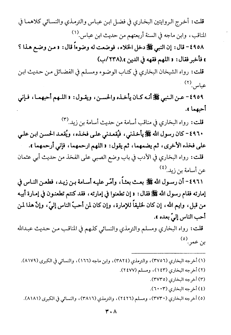 قلت: أخرج الروايتين البخاري في فضل ابن عباس والترمذي والنسائي كلاهما في المناقب، وابن ماجه في السنة أربعتهم من حديث ابن عباس. (¬1)
