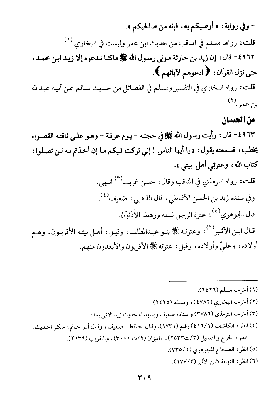 4963 - قال: رأيت رسول الله -صلى الله عليه وسلم- في حجته -يوم عرفة- وهو على ناقته القصواء يخطب، فسمعته يقول: "يا أيها الناس! إني تركت فيكم ما إن أخذتم به لن تضلوا: كتاب الله، وعترتي أهل بيتي".