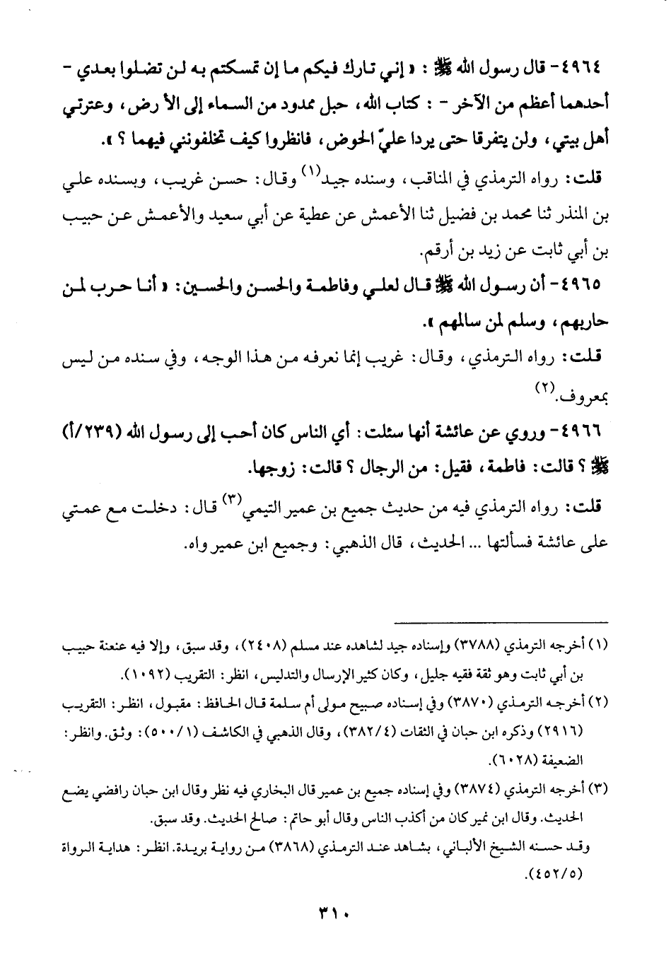 4965 - أن رسول الله -صلى الله عليه وسلم- قال لعلي وفاطمة والحسن والحسين: "أنا حرب لمن حاربهم، وسلم لمن سالمهم".