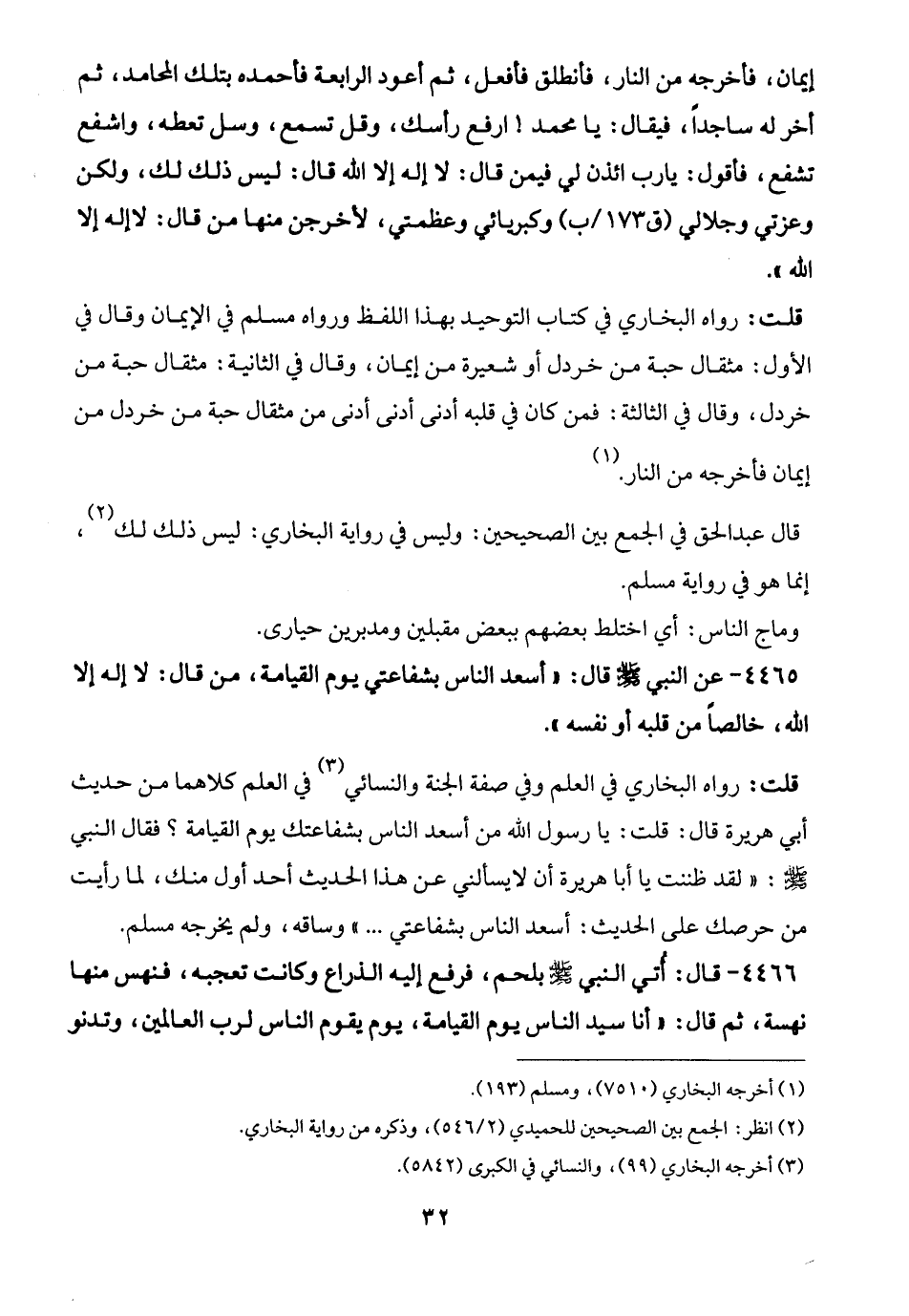 قلت: رواه البخاري في كتاب التوحيد بهذا اللفظ ورواه مسلم في الإيمان وقال في الأول: مثقال حبة من خردل أو شعيرة من إيمان، وقال في الثانية: مثقال حبة من خردل، وقال في الثالثة: فمن كان في قلبه أدنى أدنى أدنى من مثقال حبة من خردل من إيمان فأخرجه من النار. (¬1)