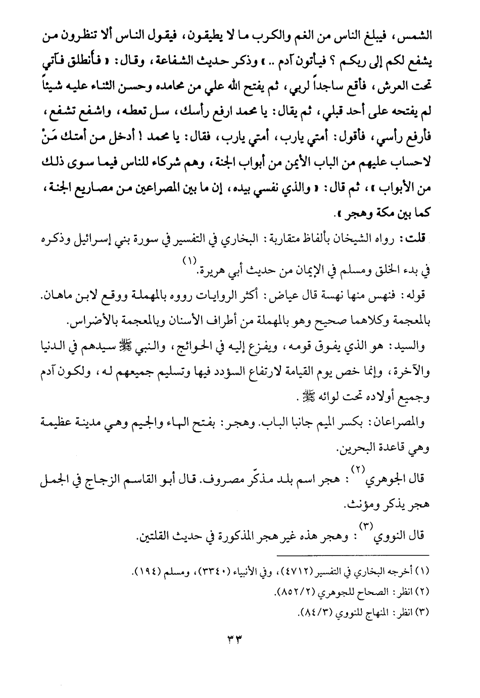 الشمس، فيبلغ الناس من الغم والكرب ما لا يطيقون، فيقول الناس ألا تنظرون من يشفع لكم إلى ربكم؟ فيأتون آدم .. " وذكر حديث الشفاعة، وقال: "فأَنطلق فآتي تحت العرش، فأقع ساجدًا لربي، ثم يفتح الله علي من محامده وحسن الثناء عليه شيئًا لم يفتحه على أحد قبلي، ثم يقال: يا محمد ارفع رأسك، سل تعطه، واشفع تشفع، فأرفع رأسي، فأقول: أمتي يا رب، أمتي يا رب، فقال: يا محمد! أدخل من أمتك مَنْ لا حساب عليهم من الباب الأيمن من أبواب الجنة، وهم شركاء للناس فيما سوى ذلك من الأبواب"، ثم قال: "والذي نفسي بيده، إن ما بين المصراعين من مصاريع الجنة، كما بين مكة وهجر".