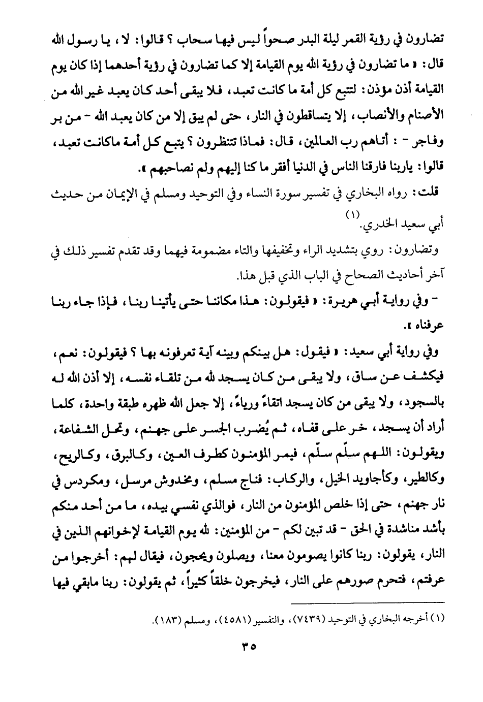 تضارون في رؤية القمر ليلة البدر صحوًا ليس فيها سحاب؟ قالوا: لا، يا رسول الله قال: "ما تضارون في رؤية الله يوم القيامة إلا كما تضارون في رؤية أحدهما إذا كان يوم القيامة أذن مؤذن: لتتبع كل أمة ما كانت تعبد، فلا يبقى أحد كان يعبد غير الله من الأصنام والأنصاب، إلا يتساقطون في النار، حتى لم يبق إلا من كان يعبد الله -من بر وفاجر-: أتاهم رب العالمين، قال: فماذا تتنظرون؟ يتبع كل أمة ما كانت تعبد، قالوا: يا ربنا فارقنا الناس في الدنيا أفقر ما كنا إليهم ولم نصاحبهم".