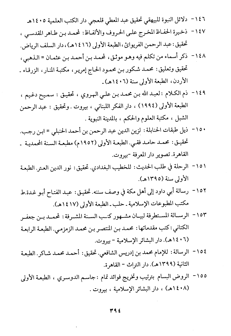 151 - الرحلة في طلب الحديث: للخطيب البغدادي. تحقيق: نور الدين العتر. الطبعة الأولى سنة (1395 هـ).