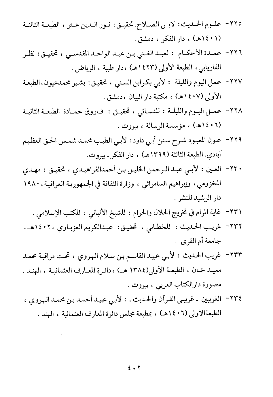 233 - غريب الحديث: لأبي عبيد القاسم بن سلام الهروي، تحت مراقبة محمد معيد خان، الطبعة الأولى (1384 هـ)، دائرة المعارف العثمانية، الهند. مصورة دار الكتاب العربي، بيروت.