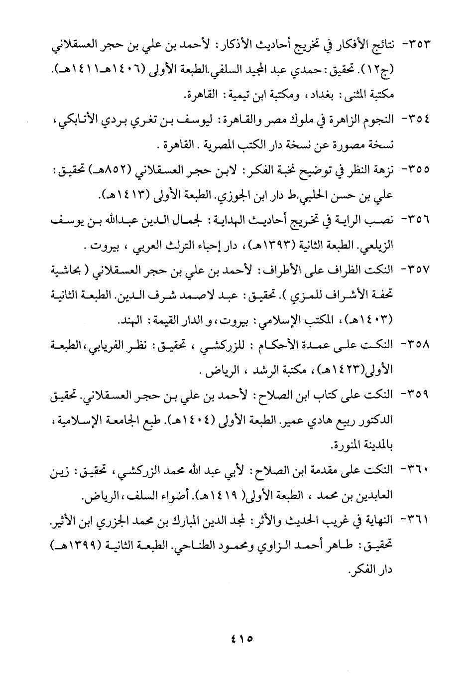 359 - النكت على كتاب ابن الصلاح: لأحمد بن علي بن حجر العسقلاني. تحقيق الدكتور ربيع هادي عمير. الطبعة الأولى (1404 هـ). طبع الجامعة الإسلامية، بالمدينة المنورة.