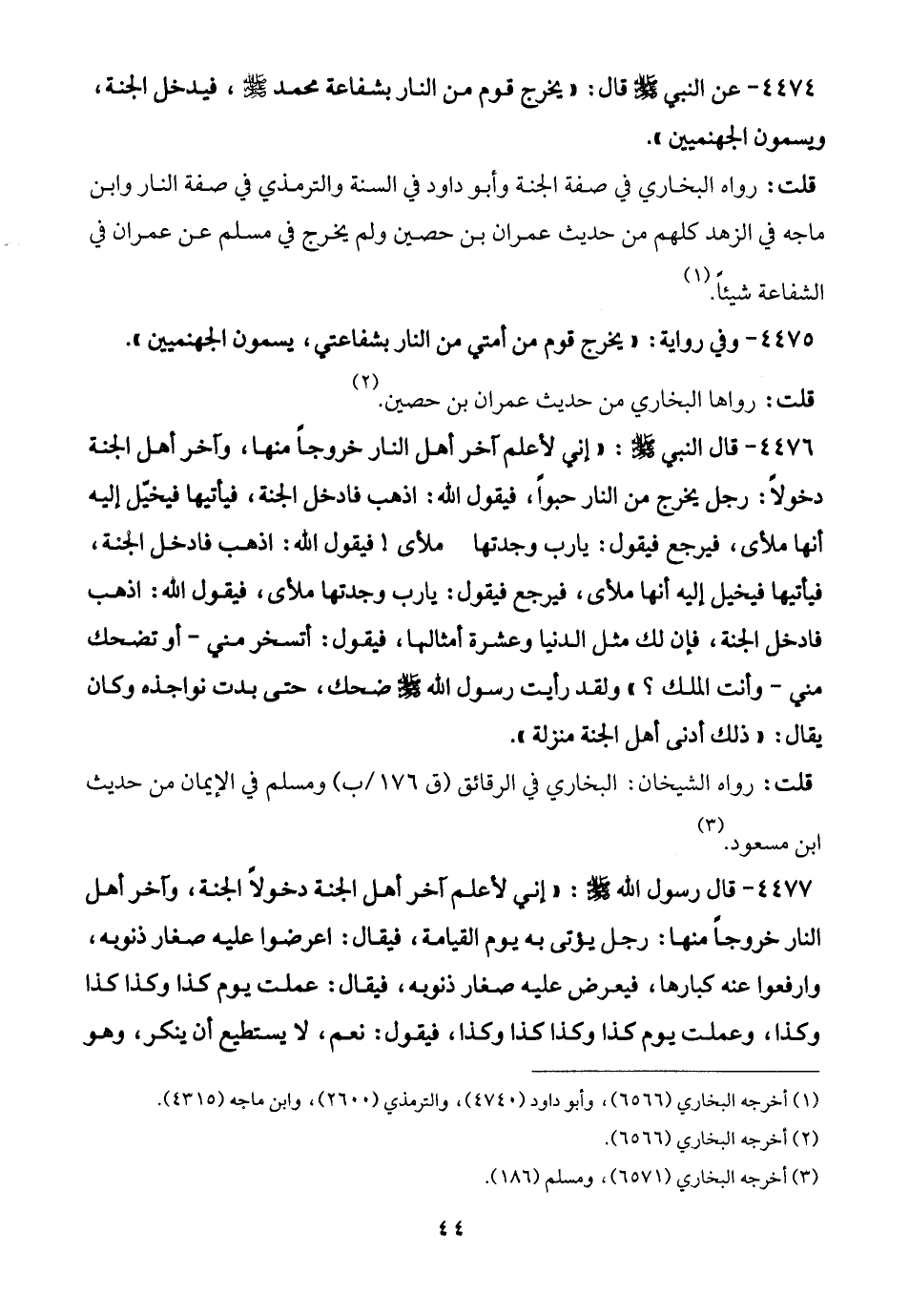 4476 - قال النبي - صلى الله عليه وسلم -: "إني لأعلم آخر أهل النار خروجًا منها، وآخر أهل الجنة دخولًا: رجل يخرج من النار حبوًا، فيقول الله: اذهب فادخل الجنة، فيأتيها فيخيّل إليه أنها ملأى، فيرجع فيقول: يا رب وجدتها ملأى! فيقول الله: اذهب فادخل الجنة، فيأتيها فيخيل إليه أنها ملأى، فيرجع فيقول: يا رب وجدتها ملأى، فيقول الله: اذهب فادخل الجنة، فإن لك مثل الدنيا وعشرة أمثالها، فيقول: أتسخر مني -أو تضحك مني- وأنت الملك؟ " ولقد رأيت رسول الله - صلى الله عليه وسلم - ضحك، حتى بدت نواجذه وكان يقال: "ذلك أدنى أهل الجنة منزلة".