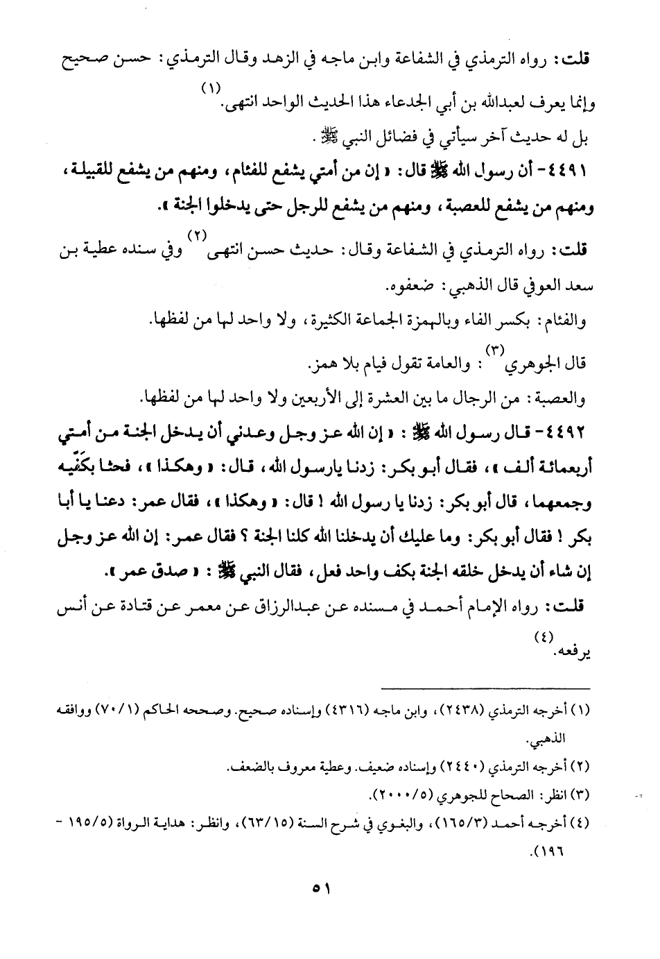 4491 - أن رسول الله - صلى الله عليه وسلم - قال: "إن من أمتي يشفع للفئام، ومنهم من يشفع للقبيلة، ومنهم من يشفع للعصبة، ومنهم من يشفع للرجل حتى يدخلوا الجنة".