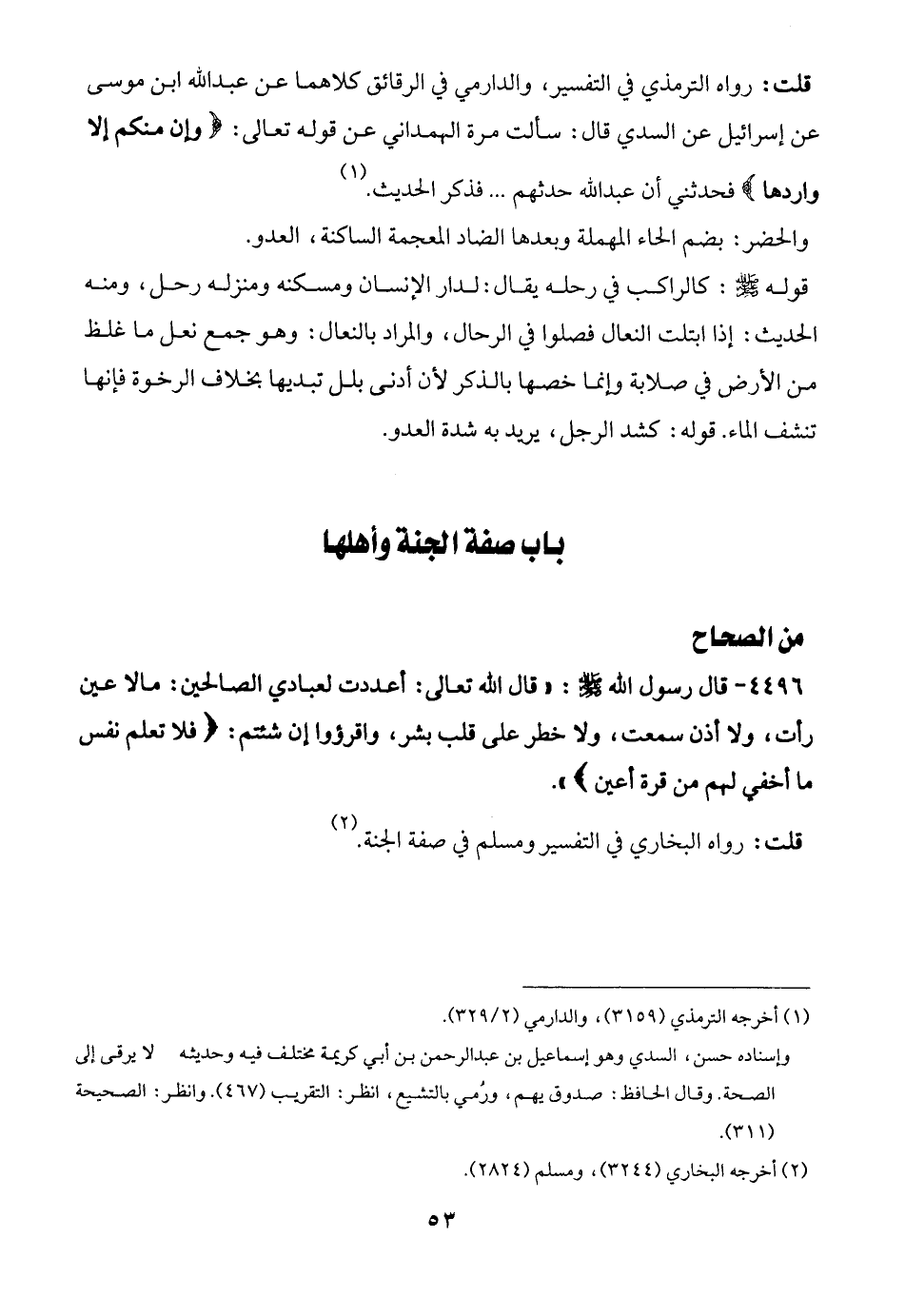 قلت: رواه الترمذي في التفسير، والدارمي في الرقائق كلاهما عن عبد الله ابن موسى عن إسرائيل عن السدي قال: سألت مرة الهمداني عن قوله تعالى: {وَإِنْ مِنْكُمْ إِلَّا وَارِدُهَا} فحدثني أن عبد الله حدثهم ... فذكر الحديث. (¬1)