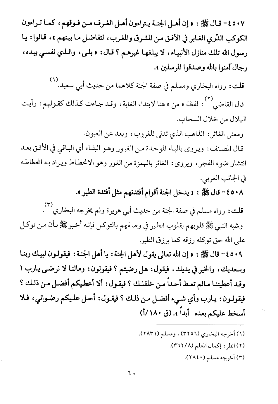 4507 - قال - صلى الله عليه وسلم -: "إن أهل الجنة يتراءون أهل الغرف من فوقهم، كما تراءون الكوكب الدّري الغابر في الأفق من المشرق والمغرب، لتفاضل ما بينهم"، قالوا: يا رسول الله تلك منازل الأنبياء، لا يبلغها غيرهم؟ قال: "بلى، والذي نفسي بيده، رجال آمنوا بالله وصدقوا المرسلين".