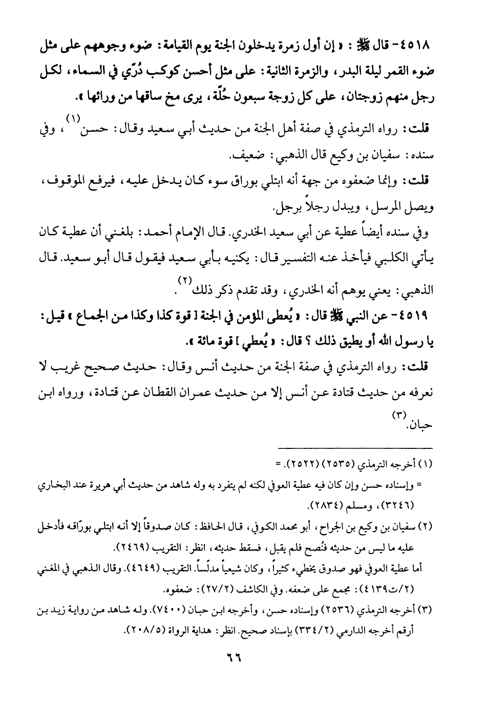 قلت: رواه الترمذي في صفة أهل الجنة من حديث أبي سعيد وقال: حسن (¬1)، وفي سنده: سفيان بن وكيع قال الذهبي: ضعيف.