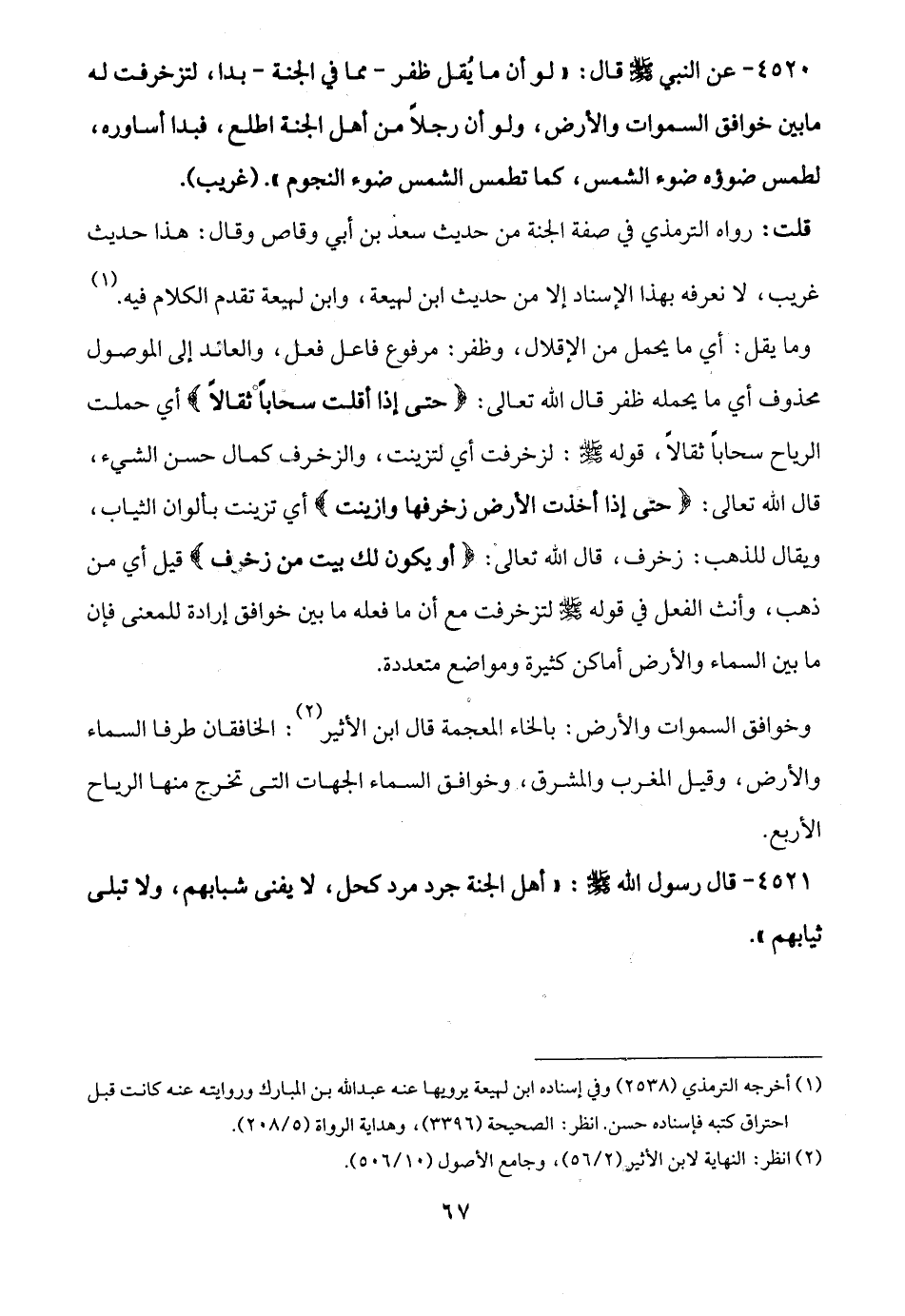 4520 - عن النبي - صلى الله عليه وسلم - قال: "لو أن ما يُقل ظفر -مما في الجنة- بدا، لتزخرفت له ما بين خوافق السموات والأرض، ولو أن رجلًا من أهل الجنة اطلع، فبدا أساوره، لطمس ضوؤه ضوء الشمس، كما تطمس الشمس ضوء النجوم". (غريب).