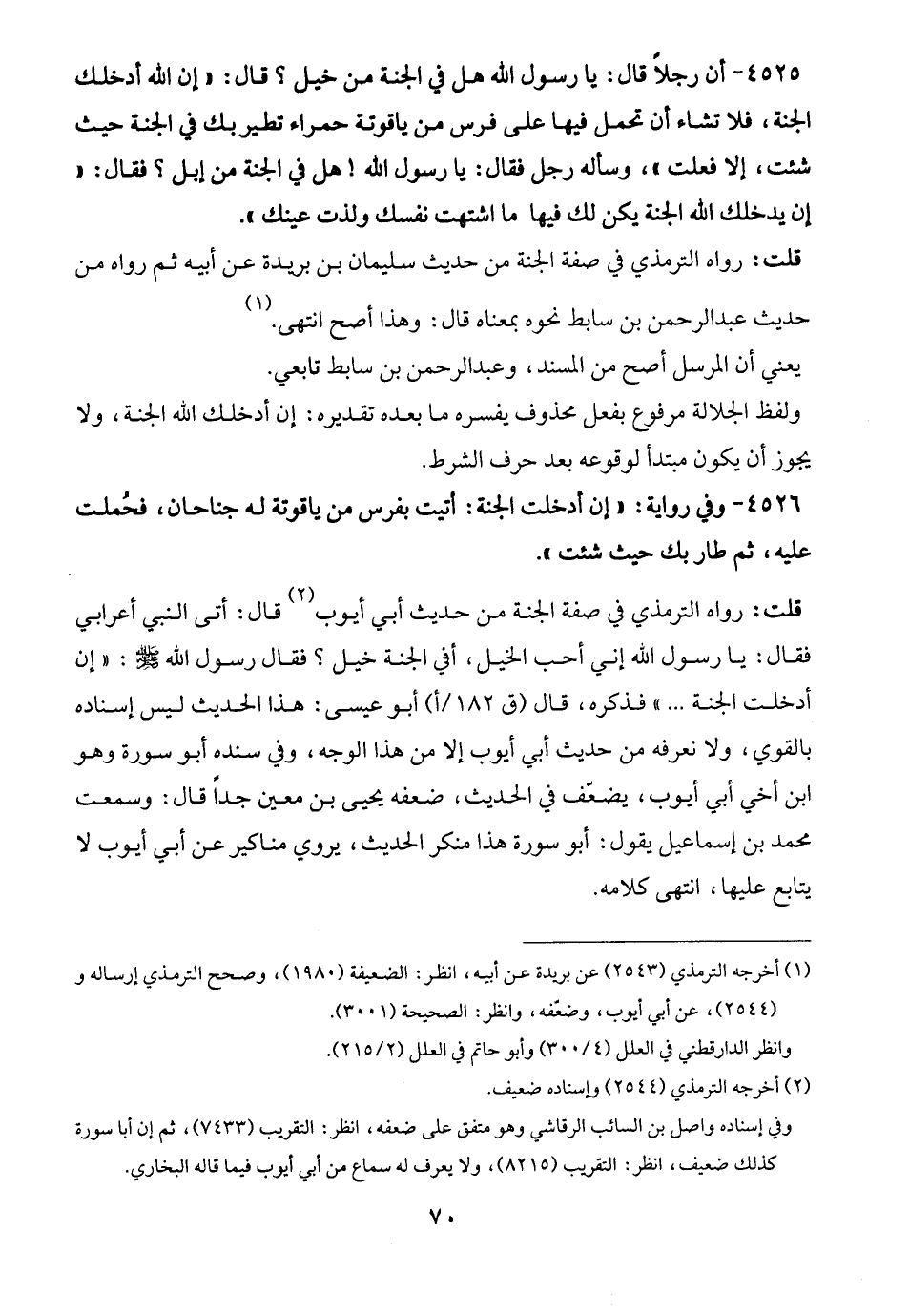 4525 - أن رجلًا قال: يا رسول الله هل في الجنة من خيل؟ قال: "إنْ الله أدخلك الجنة، فلا تشاء أن تحمل فيها على فرس من ياقوتة حمراء تطير بك في الجنة حيث شئت، إلا فعلت"، وسأله رجل فقال: يا رسول الله! هل في الجنة من إبل؟ فقال: "إن يدخلك الله الجنة يكن لك فيها ما اشتهت نفسك ولذت عينك".