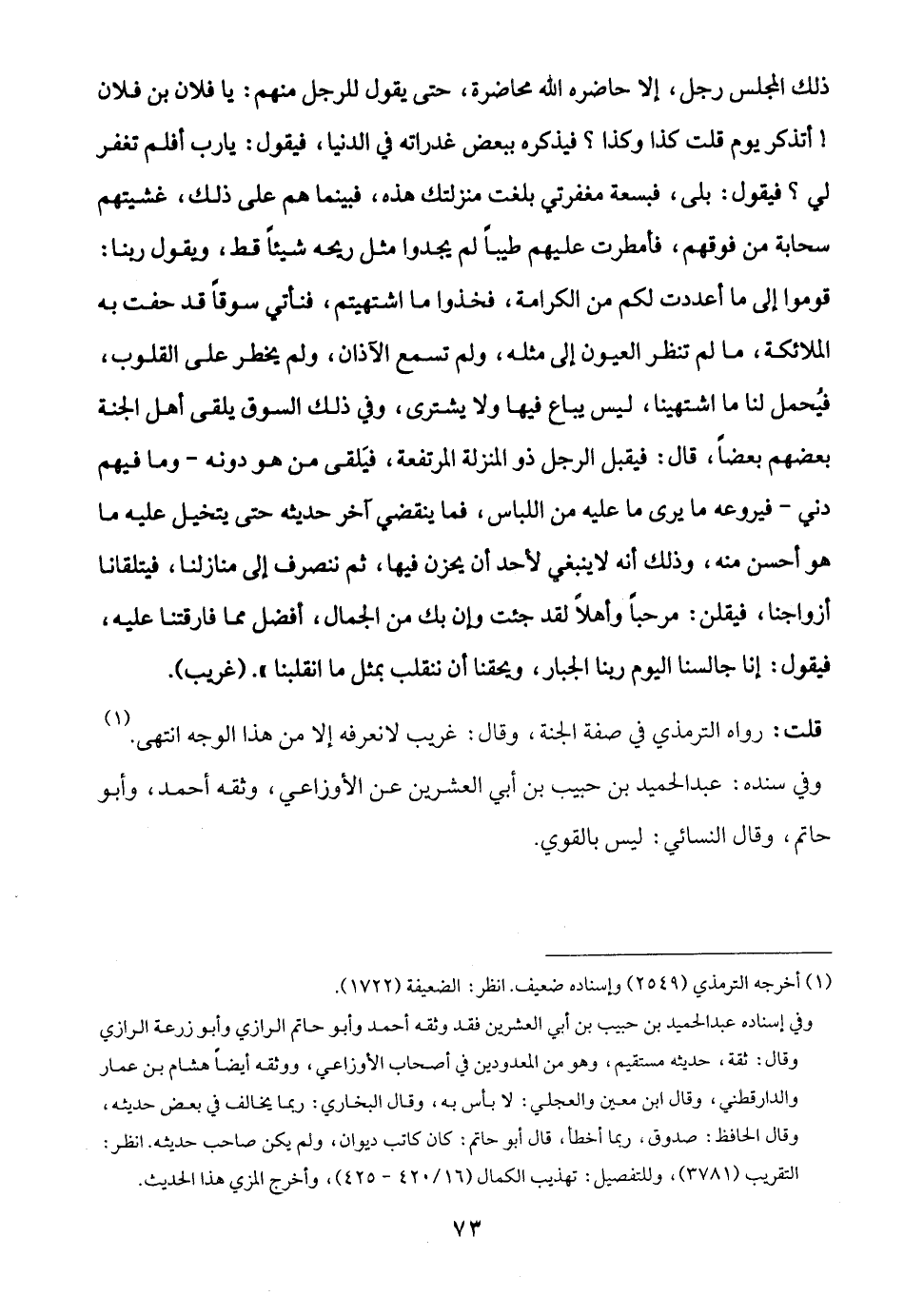 قلت: رواه الترمذي في صفة الجنة، وقال: غريب لا نعرفه إلا من هذا الوجه انتهى. (¬1)