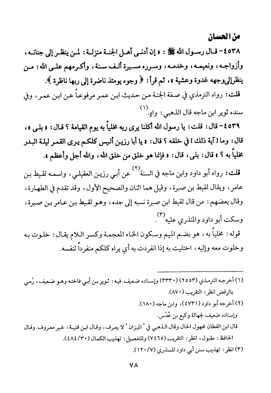 قلت: رواه الترمذي في صفة الجنة من حديث ابن عمر مرفوعًا عن ابن عمر، وفي سنده ثوير ابن ماجه قال الذهبي: واهٍ. (¬1)