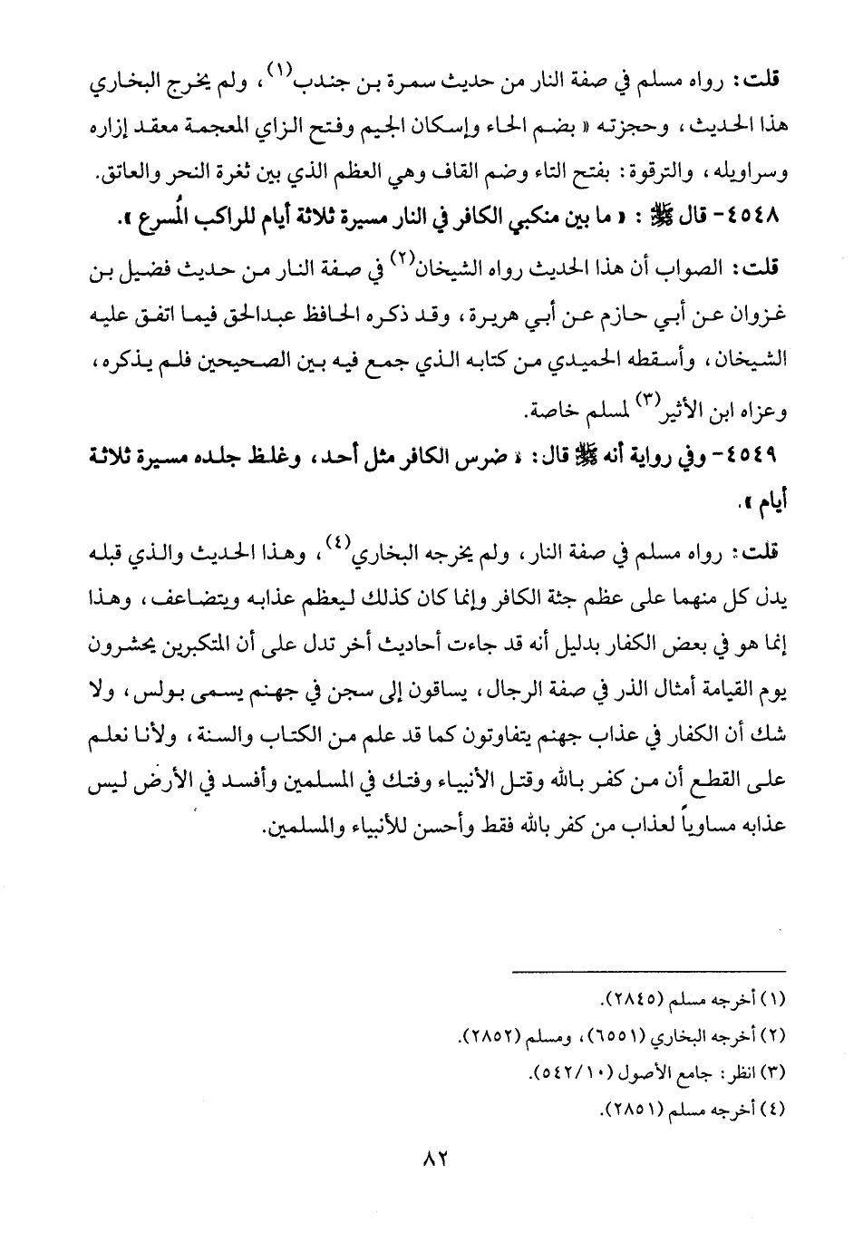 قلت: رواه مسلم في صفة النار، ولم يخرجه البخاري (¬4)، وهذا الحديث والذي قبله يدل كل منهما على عظم جثة الكافر وإنما كان كذلك ليعظم عذابه ويتضاعف، وهذا إنما هو في بعض الكفار بدليل أنه قد جاءت أحاديث أخر تدل على أن المتكبرين يحشرون يوم القيامة أمثال الذر في صفة الرجال، يساقون إلى سجن في جهنم يسمى بولس، ولا شك أن الكفار في عذاب جهنم يتفاوتون كما قد علم من الكتاب والسنة، ولأنا نعلم على القطع أن من كفر بالله وقتل الأنبياء وفتك في المسلمين وأفسد في الأرض ليس عذابه مساويًا لعذاب من كفر بالله فقط وأحسن للأنبياء والمسلمين.