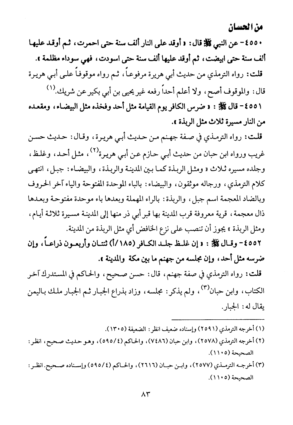 4550 - عن النبي - صلى الله عليه وسلم - قال: "أوقد على النار ألف سنة حتى احمرت، ثم أوقد عليها ألف سنة حتى ابيضت، ثم أوقد عليها ألف سنة حتى اسودت، فهي سوداء مظلمة".