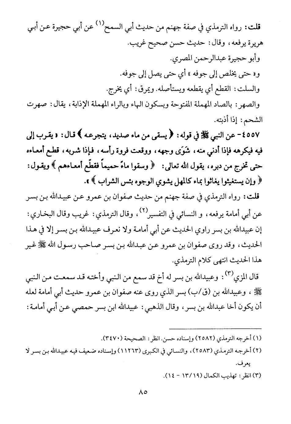 4557 - عن النبي - صلى الله عليه وسلم - في قوله: {وَيُسْقَى مِنْ مَاءٍ صَدِيدٍ، يَتَجَرَّعُهُ} قال: "يقرب إلى فيه فيكرهه فإذا أدني منه، شَوَى وجهه، ووقعت فروة رأسه، فإذا شربه، قطع أمعاءه حتى تخرج من دبره، يقول الله تعالى: {وَسُقُوا مَاءً حَمِيمًا فَقَطَّعَ أَمْعَاءَهُمْ} ويقول: {وَإِنْ يَسْتَغِيثُوا يُغَاثُوا بِمَاءٍ كَالْمُهْلِ يَشْوِي الْوُجُوهَ بِئْسَ الشَّرَابُ} ".