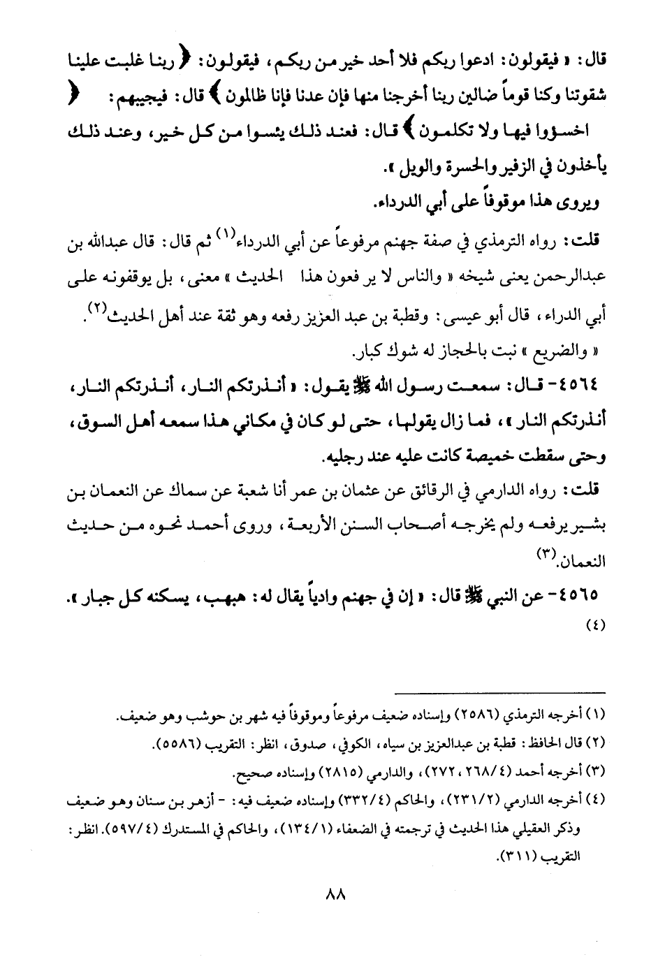 قلت: رواه الترمذي في صفة جهنم مرفوعًا عن أبي الدرداء (¬1) ثم قال: قال عبد الله بن عبد الرحمن يعني شيخه "والناس لا يرفعون هذا الحديث" معنى، بل يوقفونه على أبي الدراء، قال أبو عيسى: وقطبة بن عبد العريز رفعه وهو ثقة عند أهل الحديث (¬2).