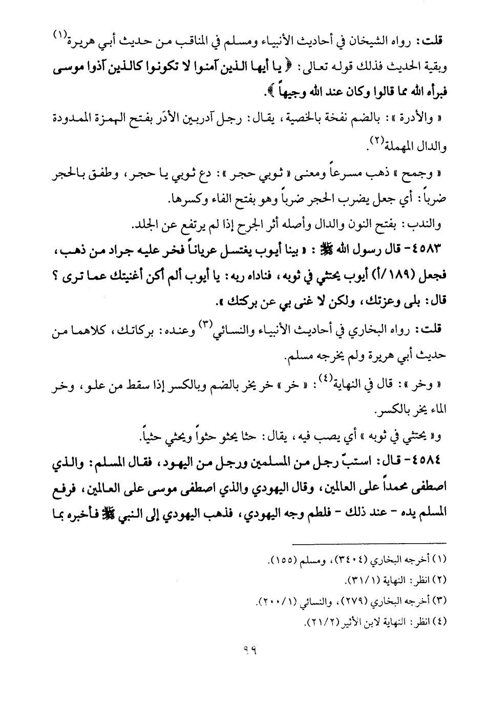 4584 - قال: استبّ رجل من المسلمين ورجل من اليهود، فقال المسلم: والذي اصطفى محمدًا على العالمين، وقال اليهودي والذي اصطفى موسى على العالمين، فرفع المسلم يده -عند ذلك- فلطم وجه اليهودي، فذهب اليهودي إلى النبي - صلى الله عليه وسلم - فأخبره بما