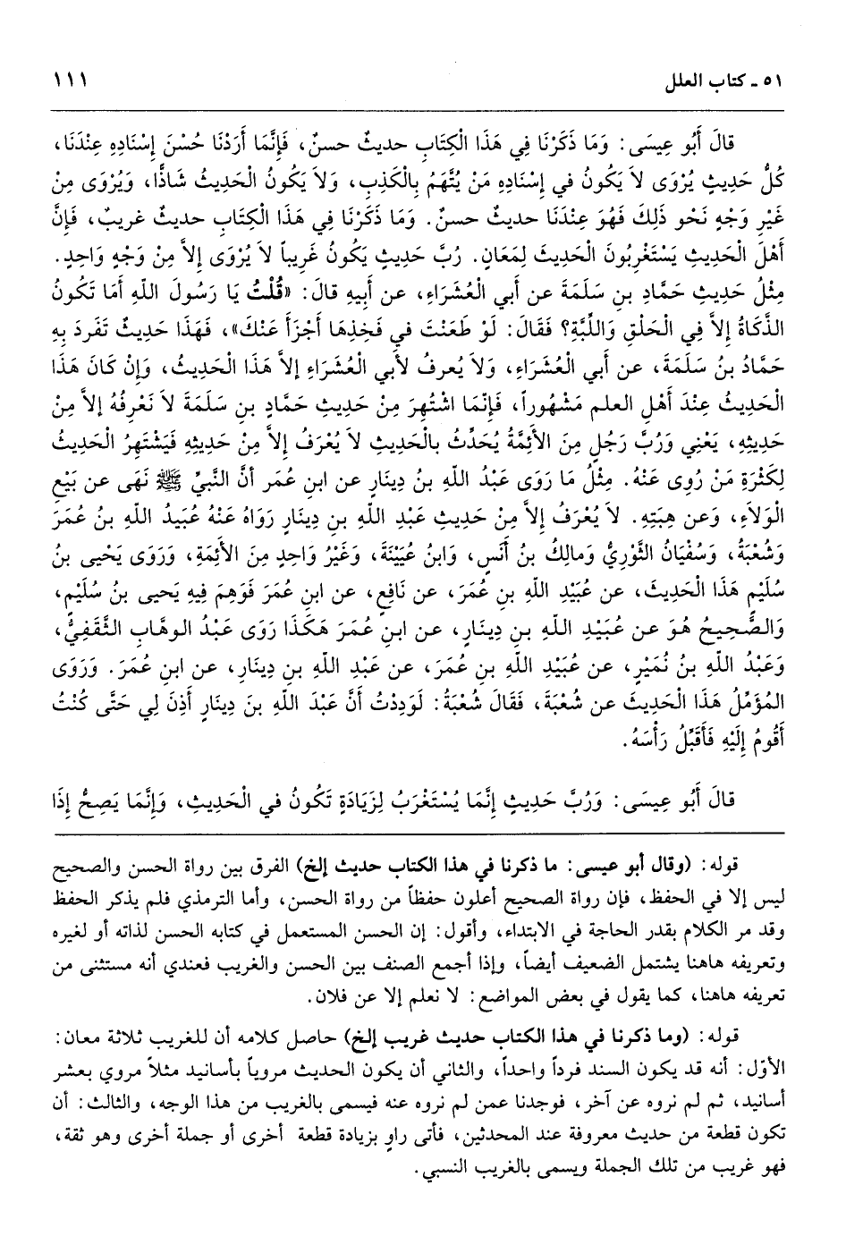 قوله: (وقال أبو عيسى: ما ذكرنا في هذا الكتاب حديث إلخ) الفرق بين رواة الحسن والصحيح ليس إلا في الحفظ، فإن رواة الصحيح أعلون حفظاً من رواة الحسن، وأما الترمذي فلم يذكر الحفظ وقد مر الكلام بقدر الحاجة في الابتداء، وأقول: إن الحسن المستعمل في كتابه الحسن لذاته أو لغيره وتعريفه هاهنا يشتمل الضعيف أيضاً، وإذا أجمع الصنف بين الحسن والغريب فعندي أنه مستثنى من تعريفه هاهنا، كما يقول في بعض المواضع: لا نعلم إلا عن فلان.