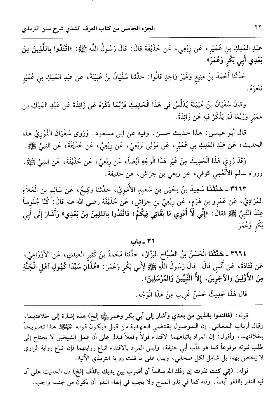 [3663] قوله: (فاقتدوا بالذين من بعدي وأشار إلى أبي بكر وعمر إلخ) هذه إشارة إلى خلافتهما، وقال أرباب المعاني: إن الموصول يقتضي العهدية من قبل فيكون قوله هذا تصريحاً بخلافتهما، وأقول: إن المراد باتباعهما الاقتداء قولاً وفعلاً فيدل على أن عمل الشيخين لا يحتاج إلى طلب ثبوته مرفوعاً كما هو دأب أبي حنيفة، وليس المراد بالاقتداء اتباع روايتهما فإن اتباع رواية الراوي لا يختص بهما بل شامل لكل صحابي، ويدل على ما قلت رواية الترمذي الآتية.