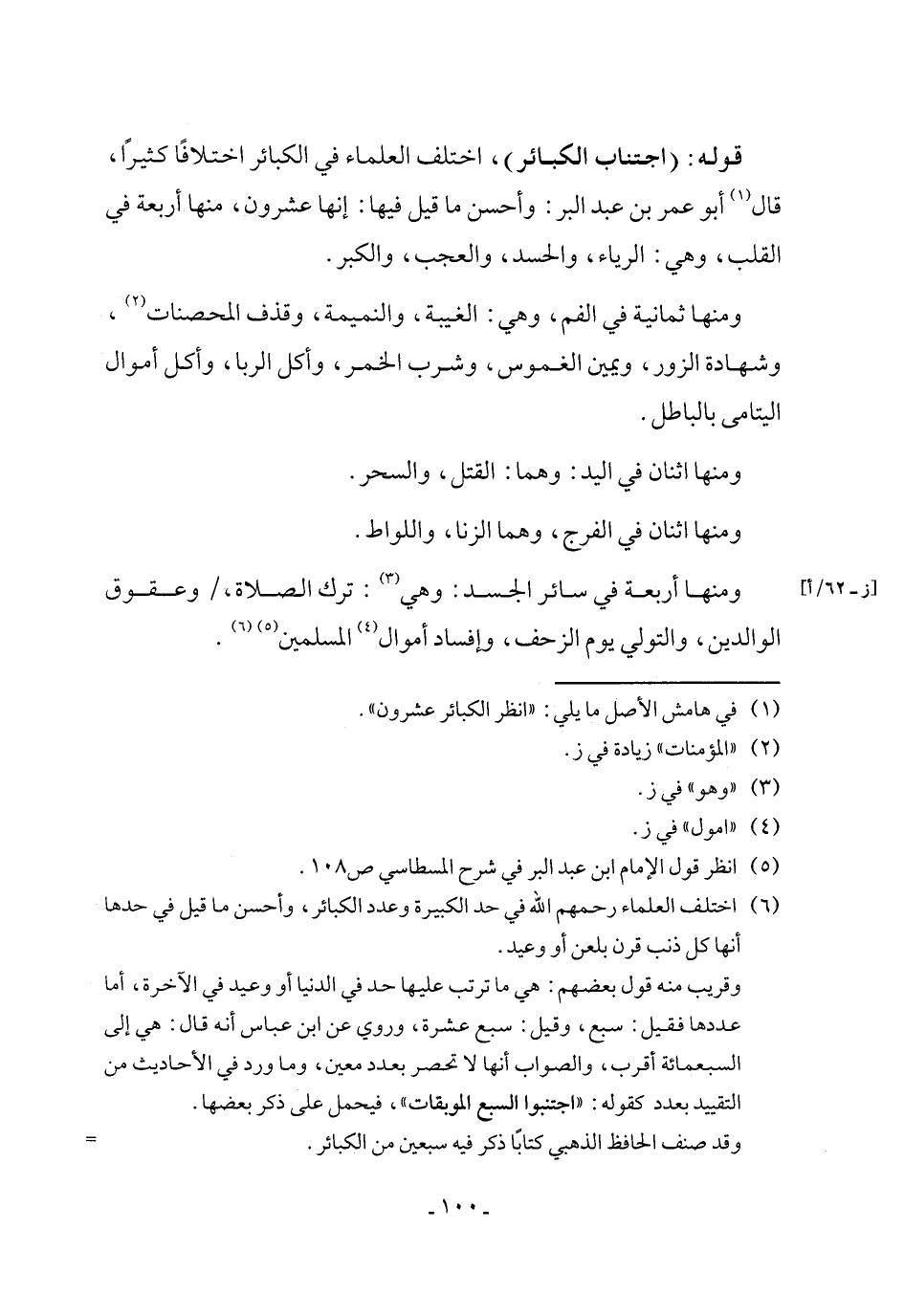 (٦) اختلف العلماء رحمهم الله في حد الكبيرة وعدد الكبائر، وأحسن ما قيل في حدها أنها كل ذنب قرن بلعن أو وعيد.