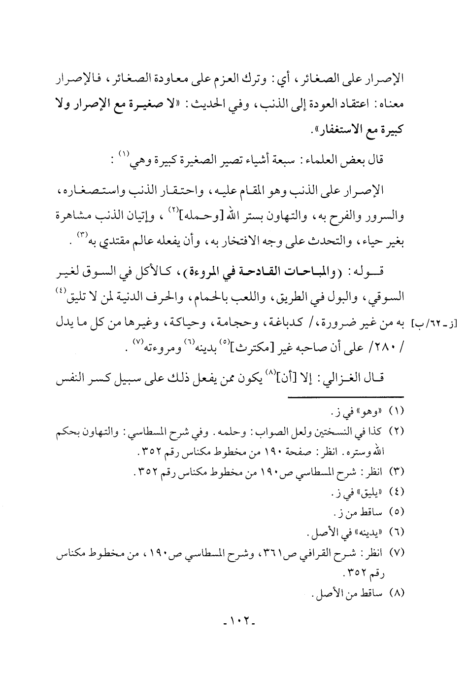 قوله: (والمباحات القادحة في المروءة)، كالأكل في السوق لغير السوقي، والبول في الطريق، واللعب بالحمام، والحرف الدنية لمن لا تليق (٤) به من غير ضرورة، كدباغة، وحجامة، وحياكة، وغيرها من كل ما يدل /٢٨٠/ على أن صاحبه غير [مكترث] (٥) بدينه (٦) ومروءته (٧).