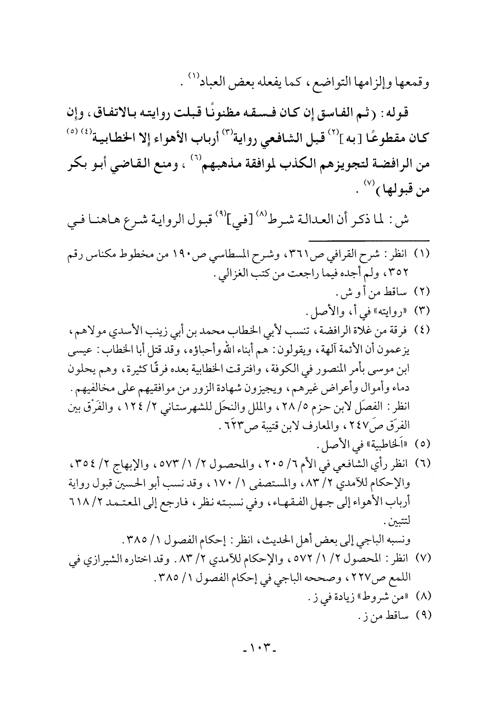 (٦) انظر رأي الشافعي في الأم ٦/ ٢٠٥، والمحصول ٢/ ١/ ٥٧٣، والإبهاج ٢/ ٣٥٤، والإحكام للآمدي ٢/ ٨٣، والمستصفى ١/ ١٧٠، وقد نسب أبو الحسين قبول رواية أرباب الأهواء إلى جهل الفقهاء، وفي نسبته نظر، فارجع إلى المعتمد ٢/ ٦١٨ لتتبين.
