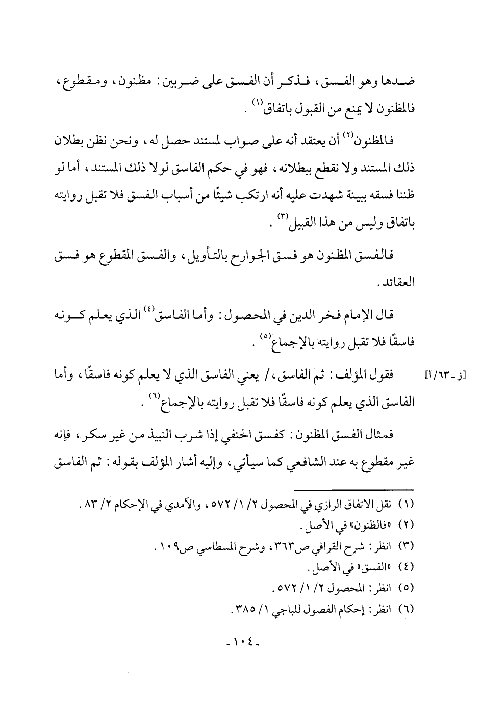 فمثال الفسق المظنون: كفسق الحنفي إذا شرب النبيذ من غير سكر، فإنه غير مقطوع به عند الشافعي كما سيأتي، وإليه أشار المؤلف بقوله: ثم الفاسق