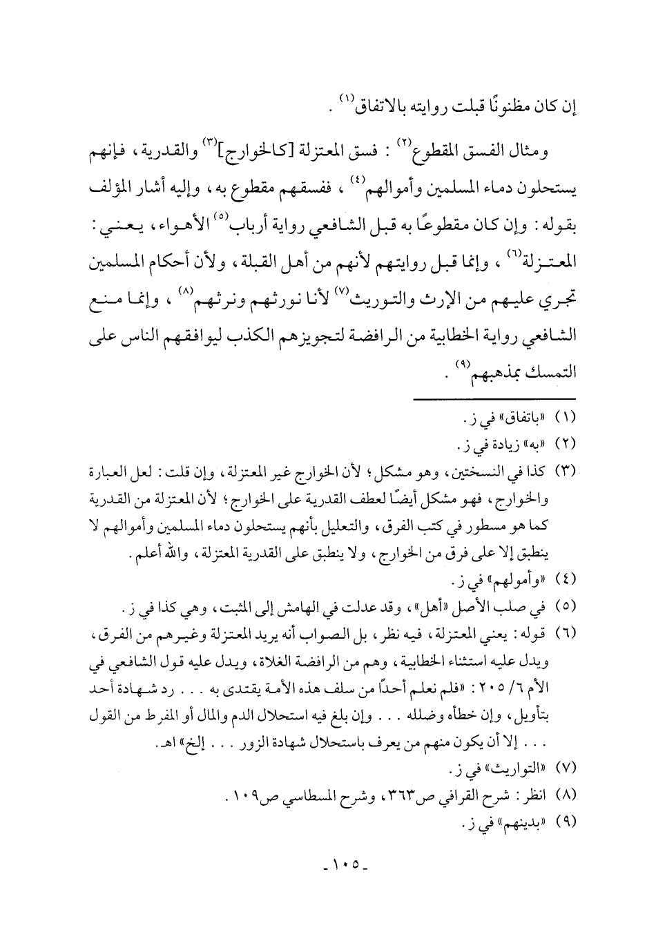 ومثال الفسق المقطوع (٢): فسق المعتزلة [كالخوارج] (٣) والقدرية، فإنهم يستحلون دماء المسلمين وأموالهم (٤)، ففسقهم مقطوع به، وإليه أشار المؤلف بقوله: وإن كان مقطوعًا به قبل الشافعي رواية أرباب (٥) الأهواء، يعني: المعتزلة (٦)، وإنما قبل روايتهم لأنهم من أهل القبلة، ولأن أحكام المسلمين تجري عليهم من الإرث والتوريث (٧) لأنا نورثهم ونرثهم (٨)، وإنما منع الشافعي رواية الخطابية من الرافضة لتجويزهم الكذب ليوافقهم الناس على التمسك بمذهبهم (٩).