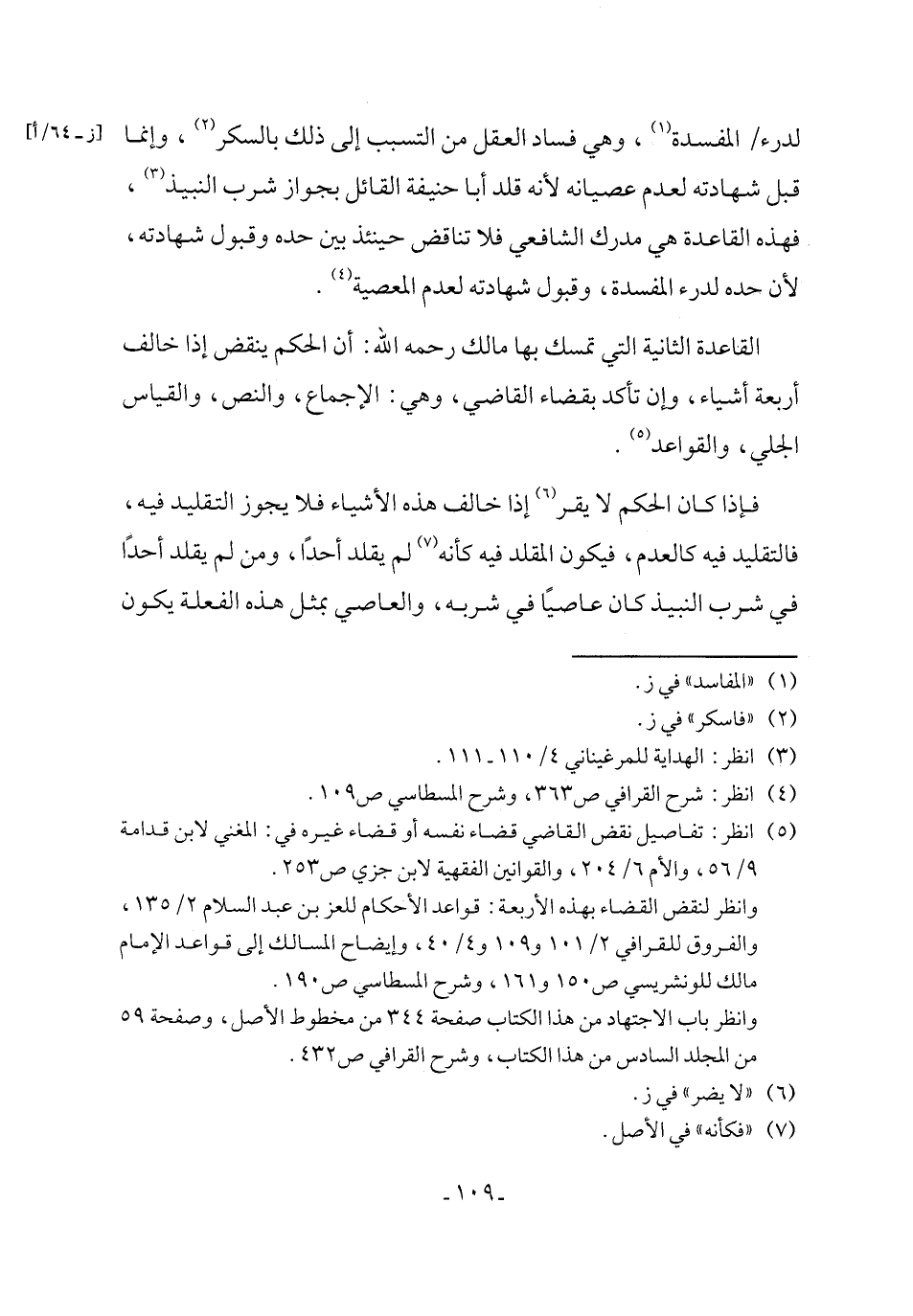 لدرء المفسدة (١)، وهي فساد العقل من التسبب إلى ذلك بالسكر (٢)، وإنما قبل شهادته لعدم عصيانه لأنه قلد أبا حنيفة القائل بجواز شرب النبيذ (٣)، فهذه القاعدة هي مدرك الشافعي فلا تناقض حينئذ بين حده وقبول شهادته، لأن حده لدرء المفسدة، وقبول شهادته لعدم المعصية (٤).
