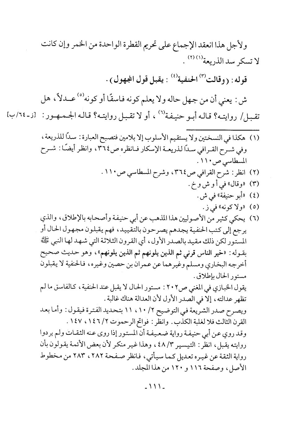 (٦) يحكي كثير من الأصوليين هذا المذهب عن أبي حنيفة وأصحابه بالإطلاق، والذي يرجع إلى كتب الحنفية يجدهم يصرحون بالتقييد، فهم يقبلون مجهول الحال أو المستور لكن ذلك مقيد بالصدر الأول، أي القرون الثلاثة التي شهد لها النبي - صلى الله عليه وسلم - بقوله: "خير الناس قرني ثم الذين يلونهم ثم الذين يلونهم"، وهو حديث صحيح أخرجه البخاري ومسلم وغيرهما عن عمران بن حصين وغيره، فالحنفية لا يقبلون مستور الحال بإطلاق.