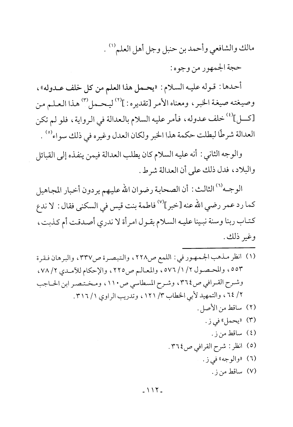 أحدها: قوله عليه السلام: "يحمل هذا العلم من كل خلف عدوله"، وصيغته صيغة الخبر، ومعناه الأمر [تقديره:] (٢) ليحمل (٣) هذا العلم من [كل] (٤) خلف عدوله، فأمر عليه السلام بالعدالة في الرواية، فلو لم تكن العدالة شرطًا لبطلت حكمة هذا الخبر ولكان العدل وغيره في ذلك سواء (٥).