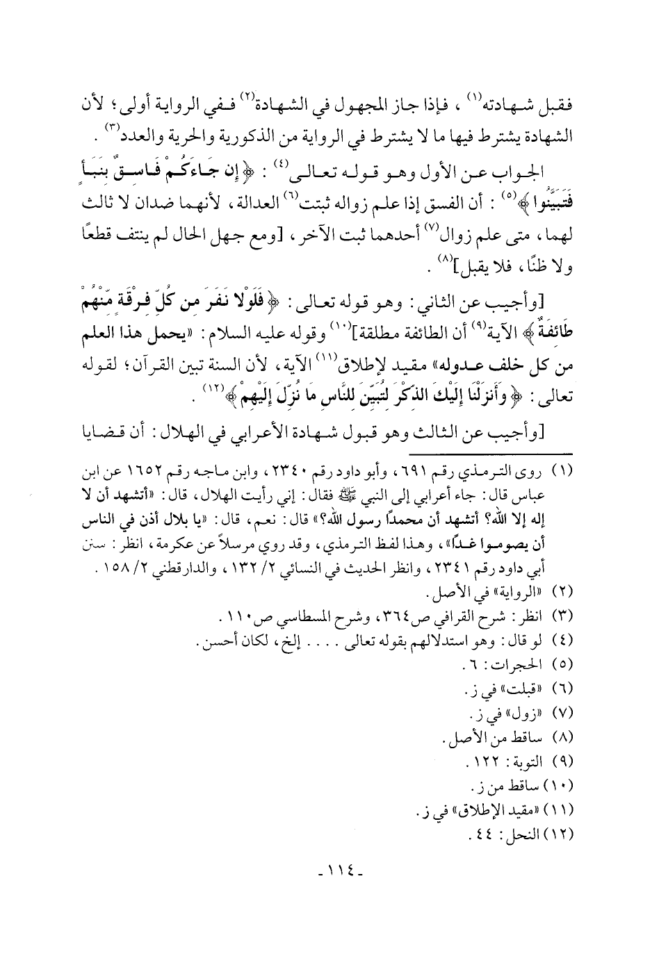 [وأجيب عن الثاني: وهو قوله تعالى: {فَلَوْلَا نَفَرَ مِنْ كُلِّ فِرْقَةٍ مِنْهُمْ طَائِفَةٌ} الآية (٩) أن الطائفة مطلقة] (١٠) وقوله عليه السلام: "يحمل هذا العلم من كل خلف عدوله" مقيد لإطلاق (١١) الآية، لأن السنة تبين القرآن؛ لقوله تعالى: {وَأَنْزَلْنَا إِلَيْكَ الذِّكْرَ لِتُبَيِّنَ لِلنَّاسِ مَا نُزِّلَ إِلَيْهِمْ} (١٢).