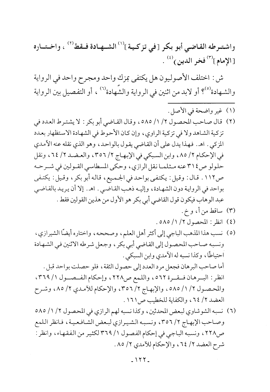ش: اختلف الأصوليون هل يكتفى بمزكٍ واحد ومجرح واحد في الرواية والشهادة (٥)؟ أو لا بد من اثنين في الرواية والشهادة (٦)، أو التفصيل بين الرواية