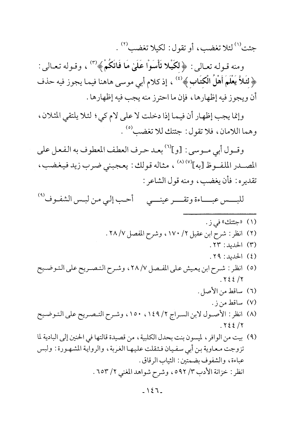 ومنه قوله تعالى: {لِكَيْلَا تَأْسَوْا عَلَى مَا فَاتَكُمْ} (٣)، وقوله تعالى: {لِئَلَّا يَعْلَمَ أَهْلُ الْكِتَابِ} (٤)، إذ كلام أبي موسى ها هنا فيما يجوز فيه حذف أن ويجوز فيه إظهارها، فإن ما احترز منه يجب فيه إظهارها.